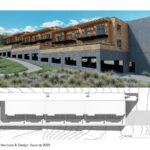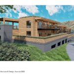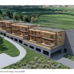 On a narrow hillside lot on the outskirts of Jackson, Wyoming, this twelve-unit apartment building serves as a gateway at the west entry to the town on Highway 22. With a church and minister’s house to the south and a few still vacant building lots to the north, the building is slotted into its site as it is terraced up the hill for apartements with wonderful views of the surrounding mountains.