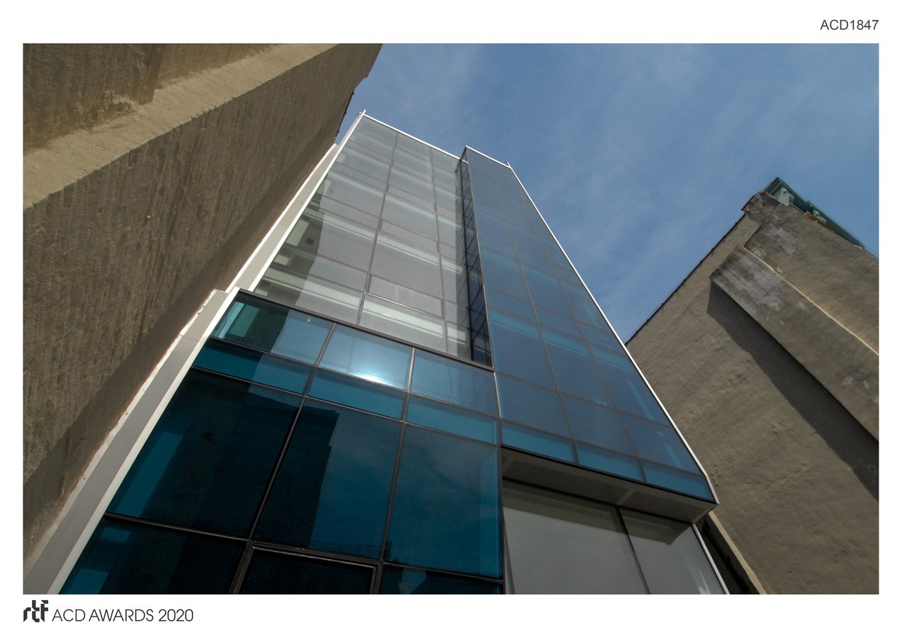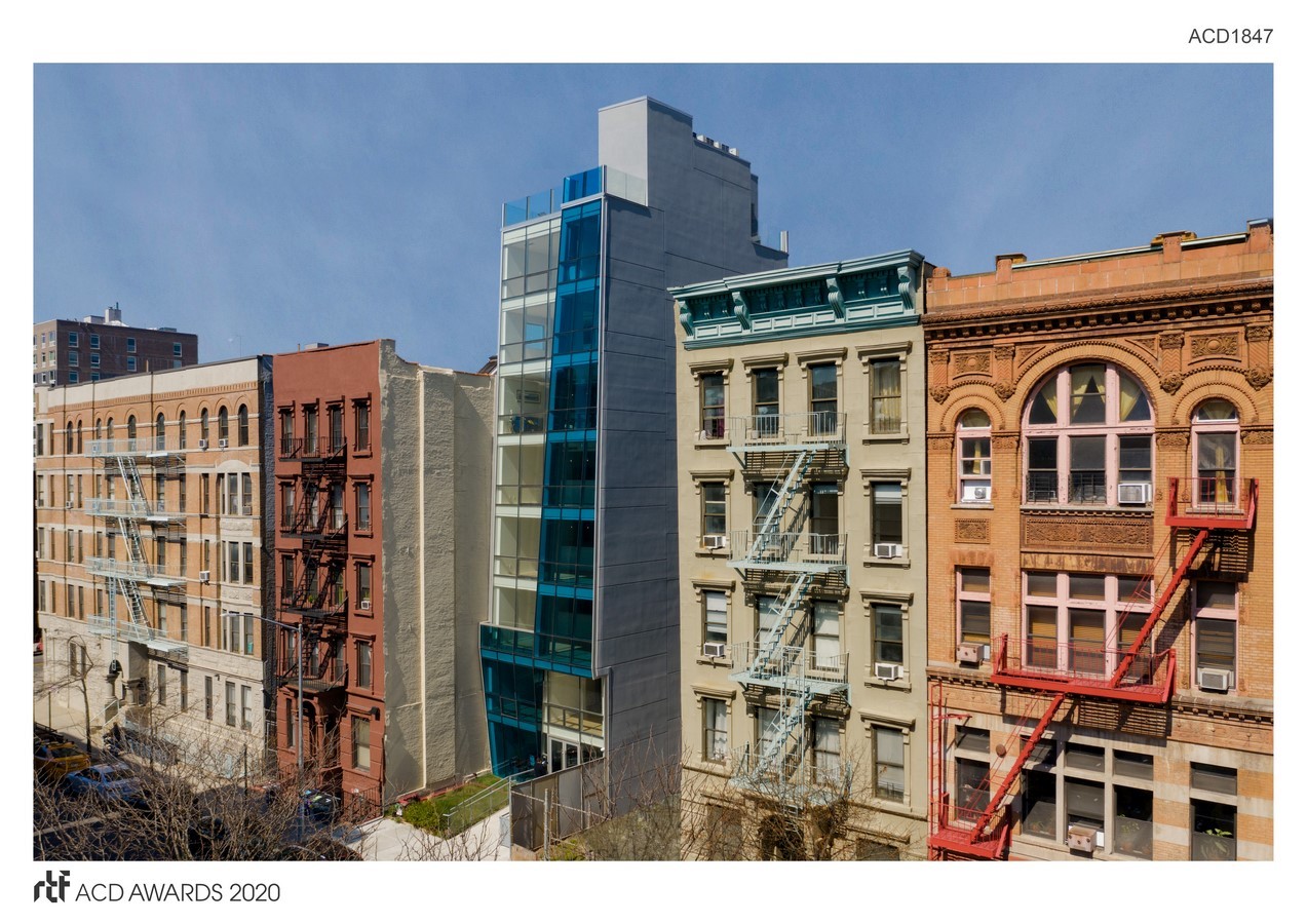 Our client challenged us to design a ground-up building that would contrast against neighboring tenements and specifically asked for an all-glass façade. The angled and faceted glass façade is a creative response to the many challenges presented by the site’s small size: it’s only 23’- 9” wide.
