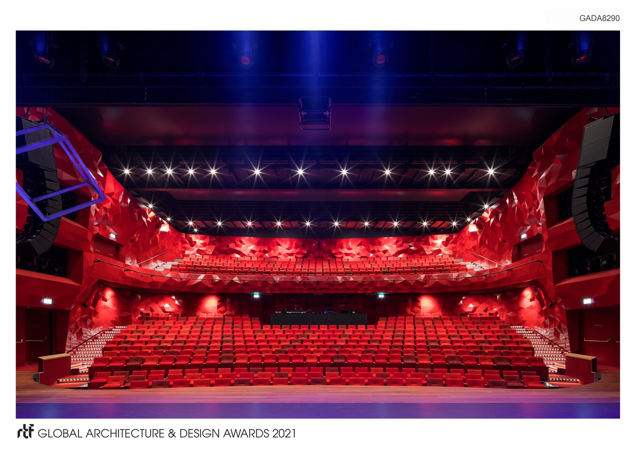 Algorithms calculated the positioning of the panels to create optimum acoustics. Also unique is how the auditorium adapts to standing concerts. The stage – whose surface area exceeds the hall – can easily be converted into a multipurpose space that fits a maximum of 1,000 standing or dancing visitors. This means comfortable fixed seating could be installed in the auditorium.