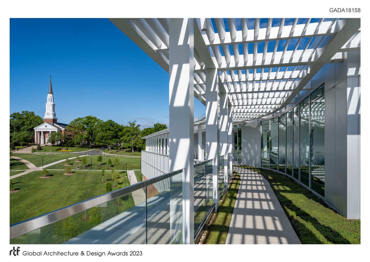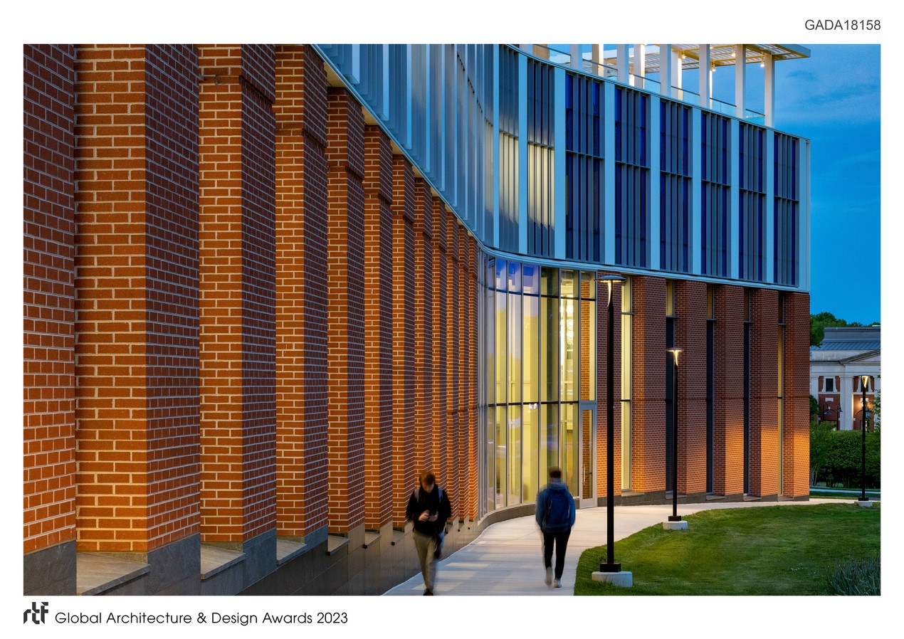 The design is rooted in the spatial typology of the ancient Agora. The cascading form follows the natural slope of Chapel Field, forming an edge to one of the signature open spaces on campus and shaping a carefully orchestrated sequence of interior spaces. Five instructional rooms, a library, a U.N.-inspired deliberative classroom and a rooftop terrace inhabit the Georgian-inspired envelope.