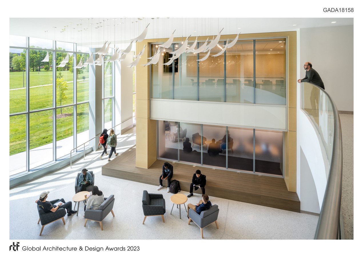 As a building dedicated to democratic thought, visibility and transparency were metaphors necessary to infuse into the design. These ideals became organizing principles from every element of the interior program and exterior expression. We went to great lengths to avoid obstructing views of the Chapel, which is the campus’s most iconic element. A wraparound glazed porch, carefully framed windows, and curated view angles embedded throughout the learning space highlight Memorial Chapel from everywhere in the building.