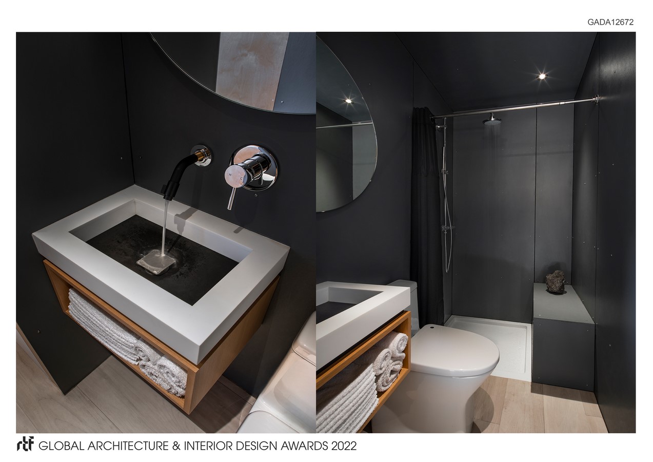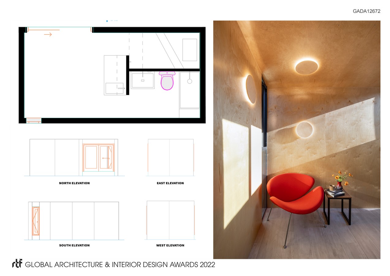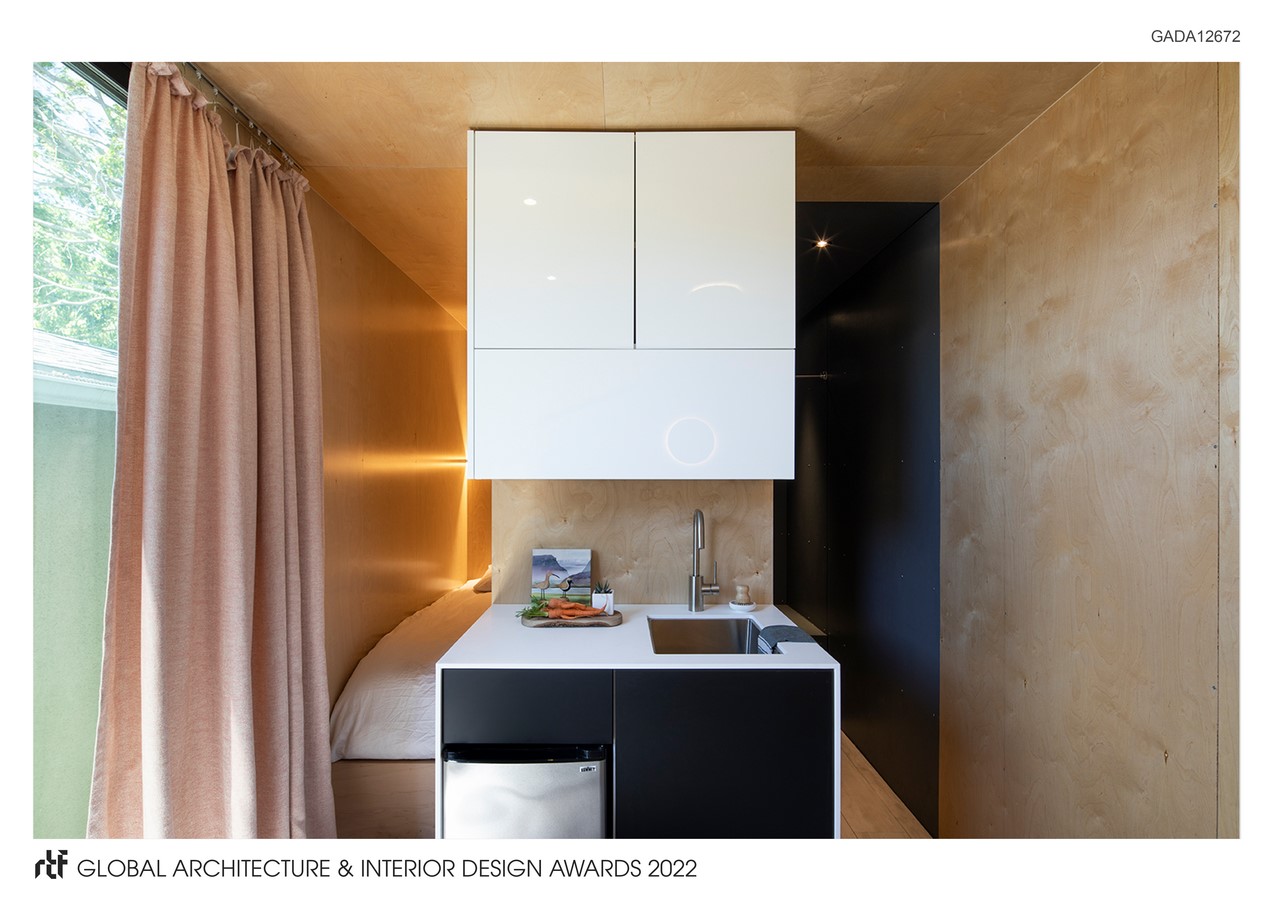 Eco-consciously designed on a tiny footprint, this 128 square-foot home is a minimal haven. Elegant clean lines and deliberate delineation of living zones create a calm sanctuary where simplicity and efficiency are foregrounded.