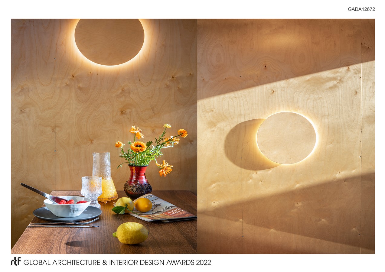 The twin-size sleeping nook bursts with a stunning lighting system hidden behind seamless maple panels, for a cozy and intimate sanctum. Mirroring the bedroom, the bathroom complements the warmth with a stark lava rock and glacial-white theme.