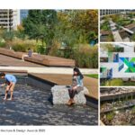 The park has spurred mixed-use development alongside a series of life science buildings to bring together urban living with research. A connectivity strategy focused on multi-mobility creates a park that connects the city to vibrant community programming with weekly and holiday performances, lectures, and yoga classes. This transformed pedestrian-oriented landscape features interactive waterfalls, tranquil streams, a central lawn, and an active play area all nestled within a biodiverse botanic garden experience.