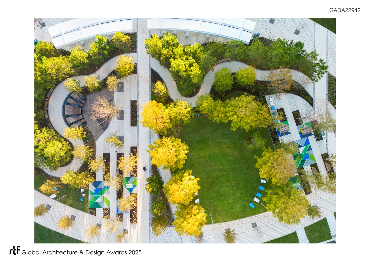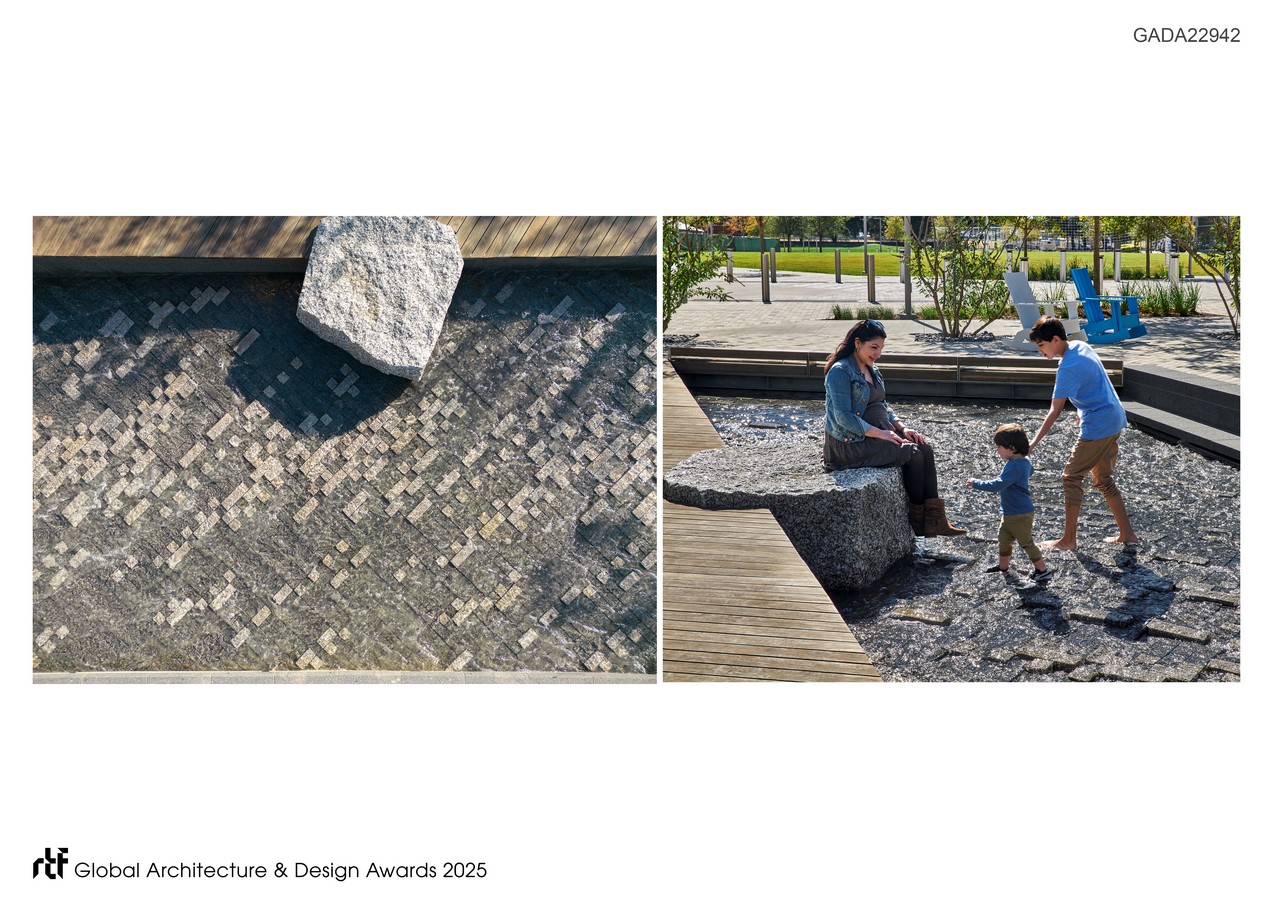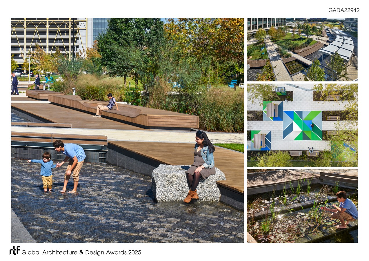 The park has spurred mixed-use development alongside a series of life science buildings to bring together urban living with research. A connectivity strategy focused on multi-mobility creates a park that connects the city to vibrant community programming with weekly and holiday performances, lectures, and yoga classes. This transformed pedestrian-oriented landscape features interactive waterfalls, tranquil streams, a central lawn, and an active play area all nestled within a biodiverse botanic garden experience.