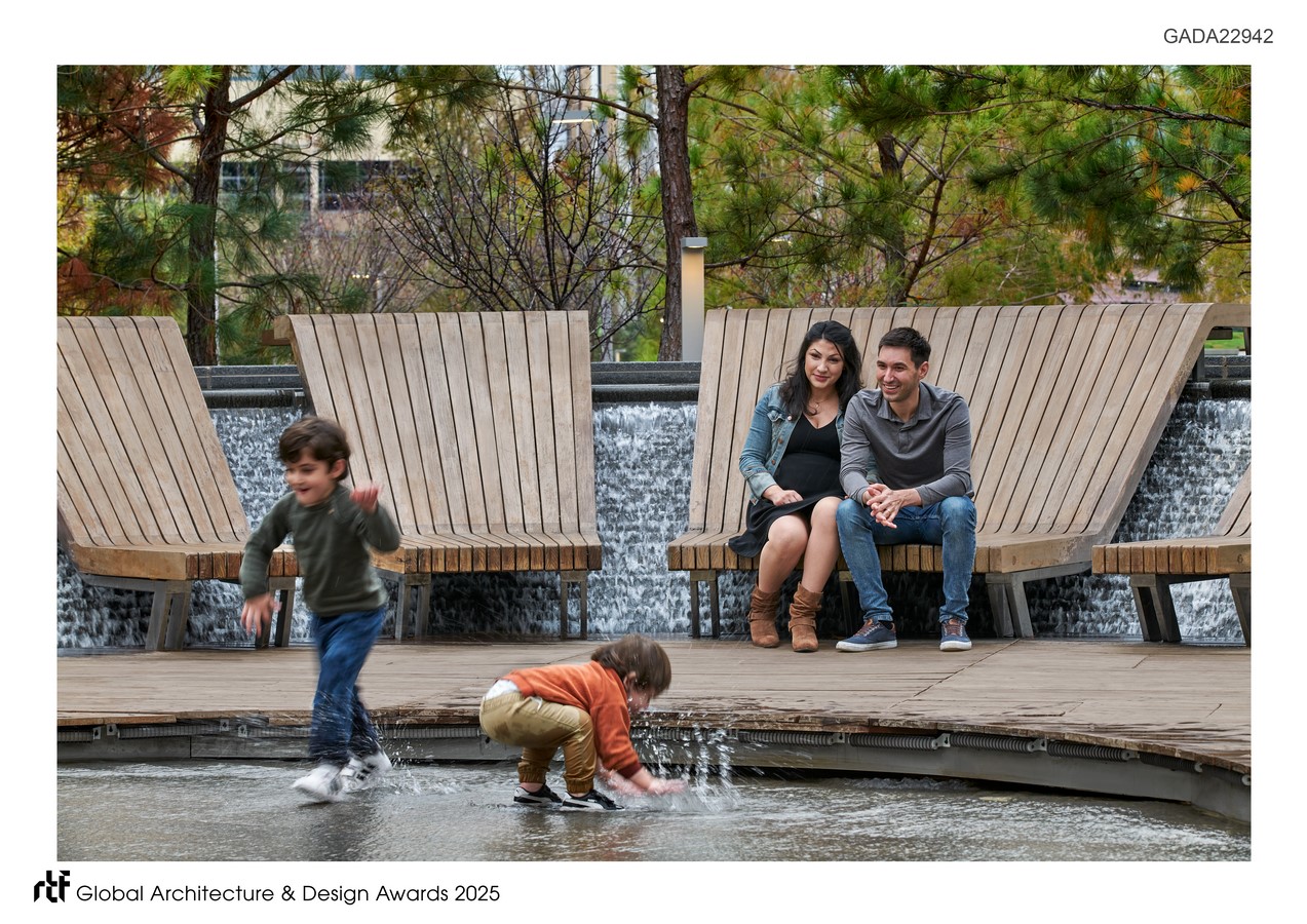 The planting strategy is designed around five Texas eco-regions and features over 300 biodiverse plant species and 650 new trees which will intercept nearly one third of the rainwater on the site. This plant palette creates a transforming experience of color, texture, and sound throughout the year. Water-play areas bring health and wellness by providing noise mitigation from the adjacent street traffic. Daylighted and cleansed stormwater feeds the fountains, while green infrastructure slows, filters, and stores stormwater in this new resilient park district.