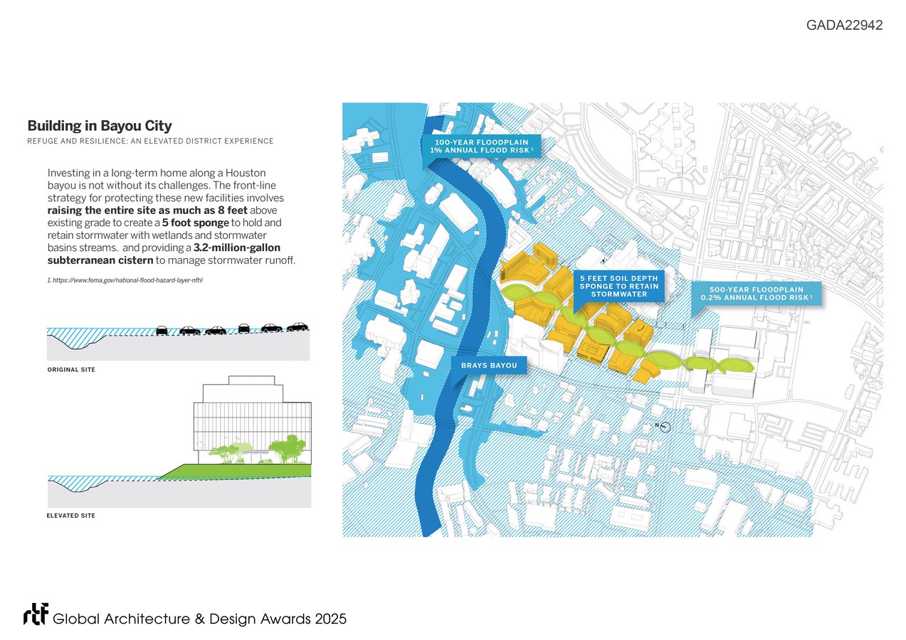 As part of a district-wide climate resiliency plan along Brays Bayou, the site was elevated by an average of six feet to enhance its ability to absorb rainwater while supporting a biodiverse planting strategy that protects the campus from flash flooding within this 500-year floodplain. In this first phase, 14.5 acres of landscape will absorb approximately 3.2 million gallons of rainwater, storing and filtering it for controlled release.
