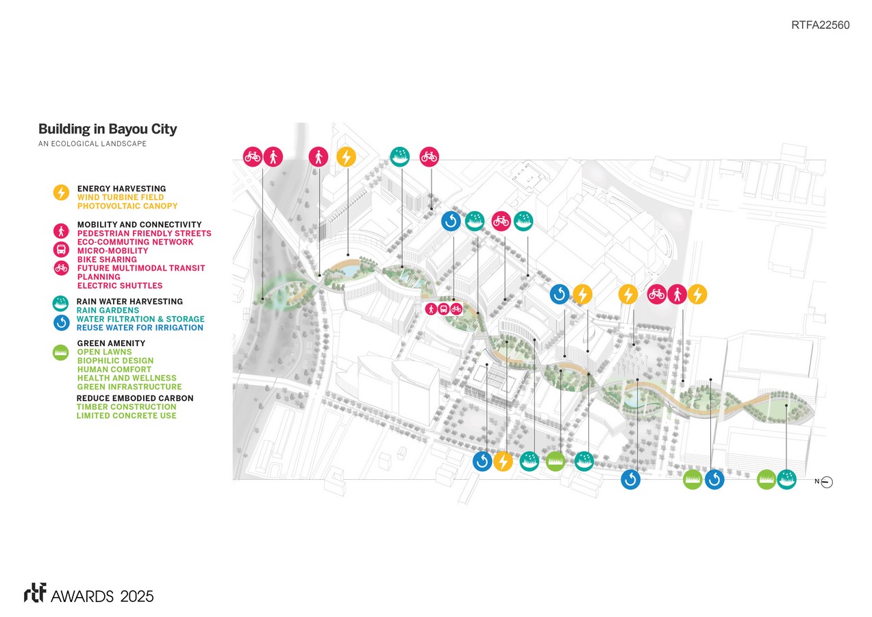 Human health and comfort define this multisensory experience with thermal comfort zones thoughtfully integrated throughout the landscape. Active mobility pathways weave through cooling water features and biodiverse gardens, forming an oasis of play and restoration. District wide multi-mobility infrastructure seamlessly connects the TMC park to Houston’s complete street plan, while all season vibrant programming invites active community engagement.