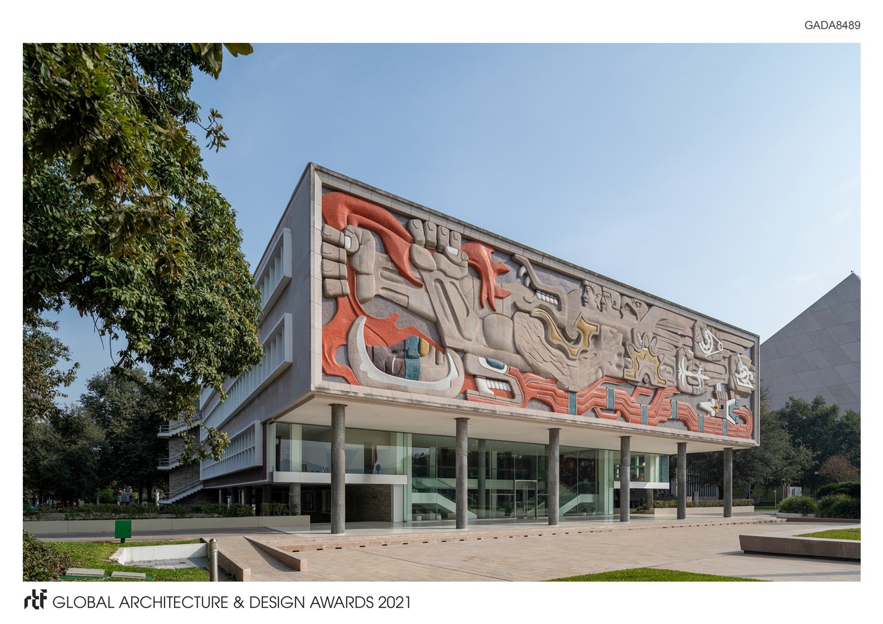 The building is defined by a mural by González Camarena that represents the battle between innovation and lack of purpose. Science is represented in the upper register, while the snakes and dark warriors occupying the lower register represent dark forces that will be conquered by innovation and technology