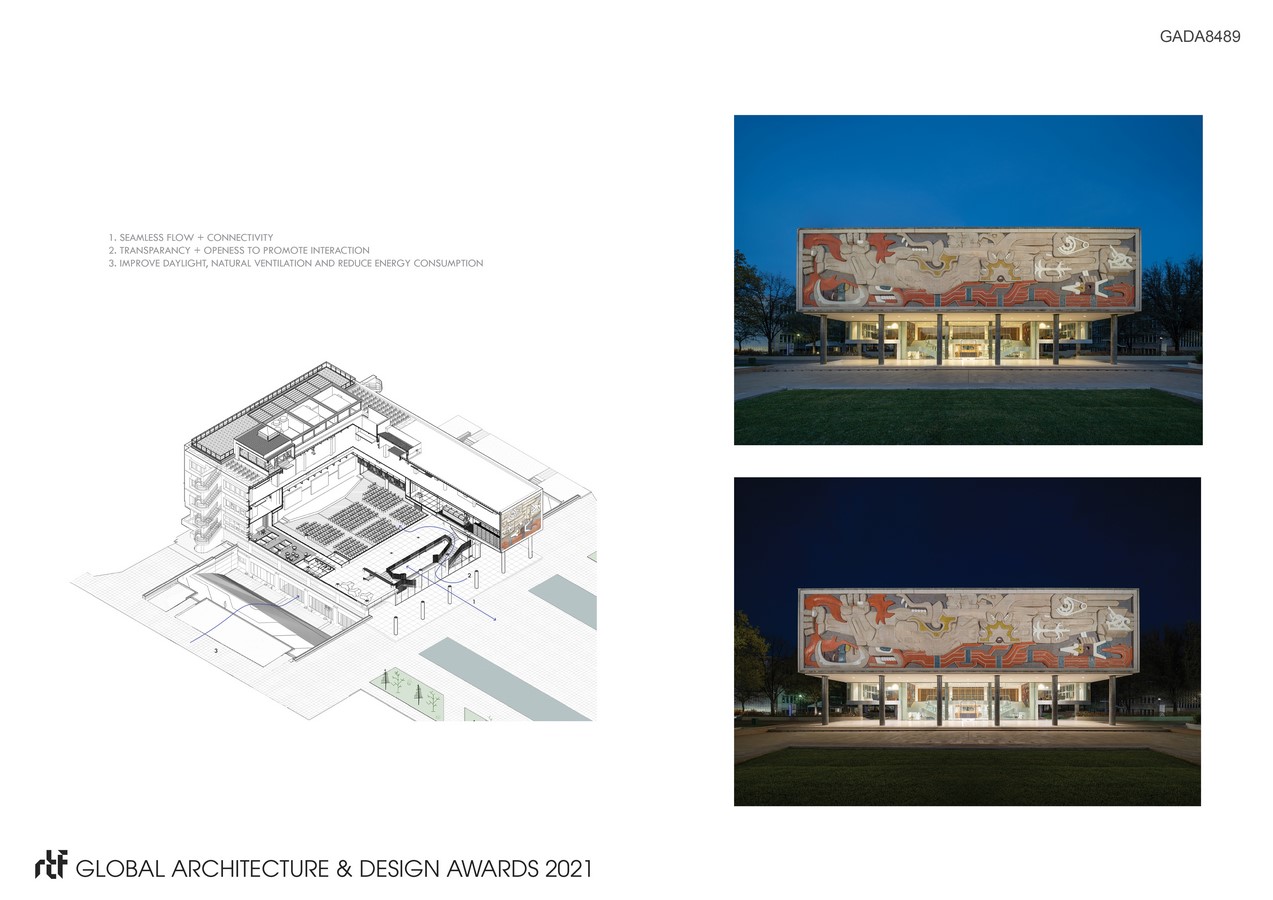 theme of innovation in the mural. The project would follow this lead of openness and be about reimagining great spaces, creating clear circulation, fostering democratic space, and transforming a mysterious and hermetic building into something extroverted and open.