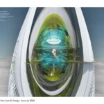 Visitors can reach the hotel by boat or helicopter, as it is located in the Pacific Ocean, fifty miles from Taiwan and 150 miles from China’s Eastern volcanic arc mainland. The inhabitable structure is modelled on a float design to enhance stability; the facade wraps a series of vertical elements that contain floating devices for the structure, helping to maintain equilibrium as a floating hotel. The hotel is anchored to the ocean bed and can be lowered as necessary, similar to a tension-leg oil rig platform.