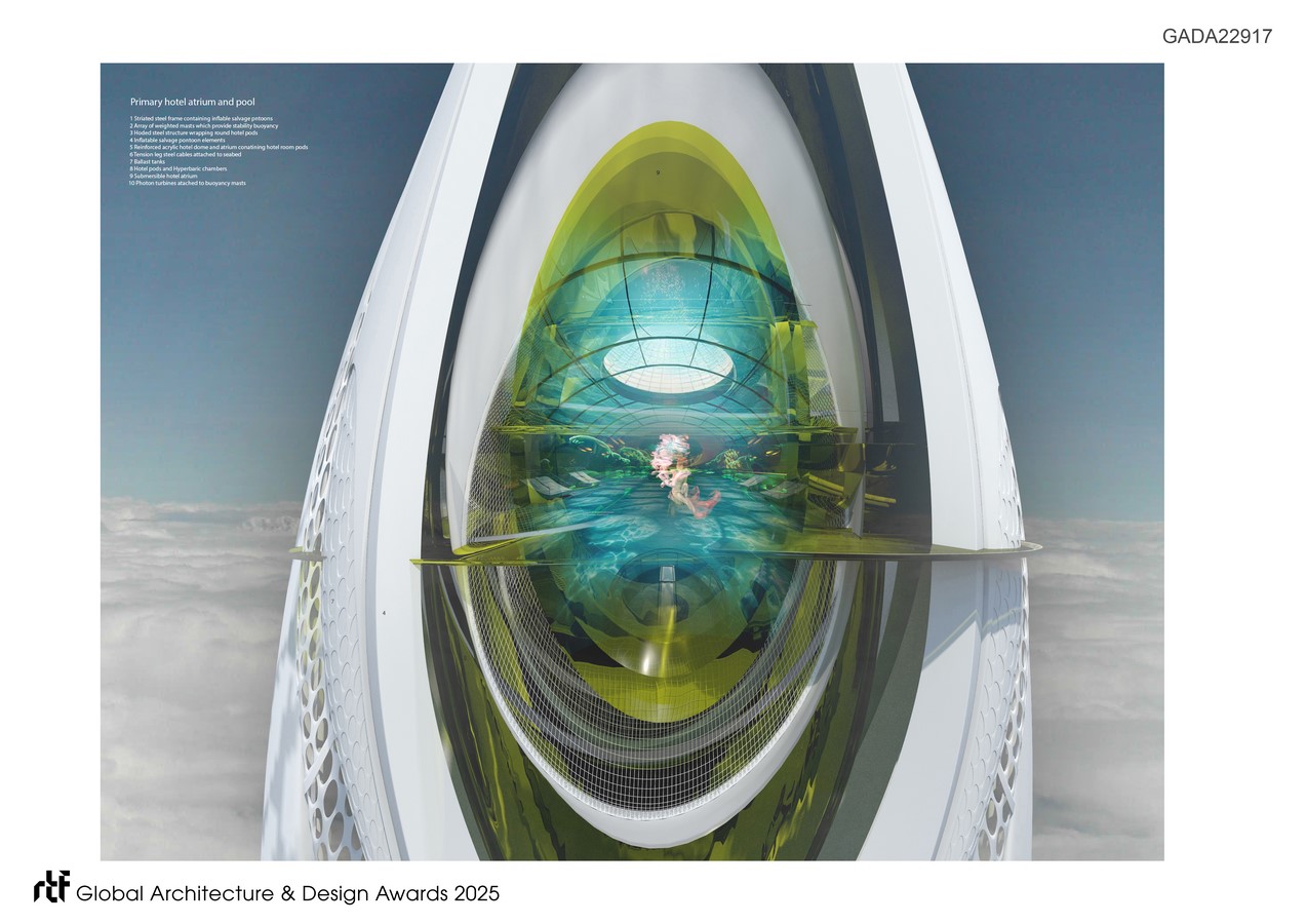 One of the focal points of the design is the inflatable facades, which act like life jackets; pockets of marine salvage inflatables expand as necessary to maintain floating stability and prevent further tilt and aid with resurfacing of the submerged hotels once the tsunami has passed. The main structure consists of a series of reinforced acrylic inhabitable pods protected by this facade. The three hotel structures are tethered to the seabed using motors to retract the structures below the water, which involves deflating the inflatable facade jackets. Other pockets contain ballast tanks, which flood, similar to a submarine, to lower the hotel into the ocean. Each room contains a hyperbaric chamber, which allows for pressure change in the environment.