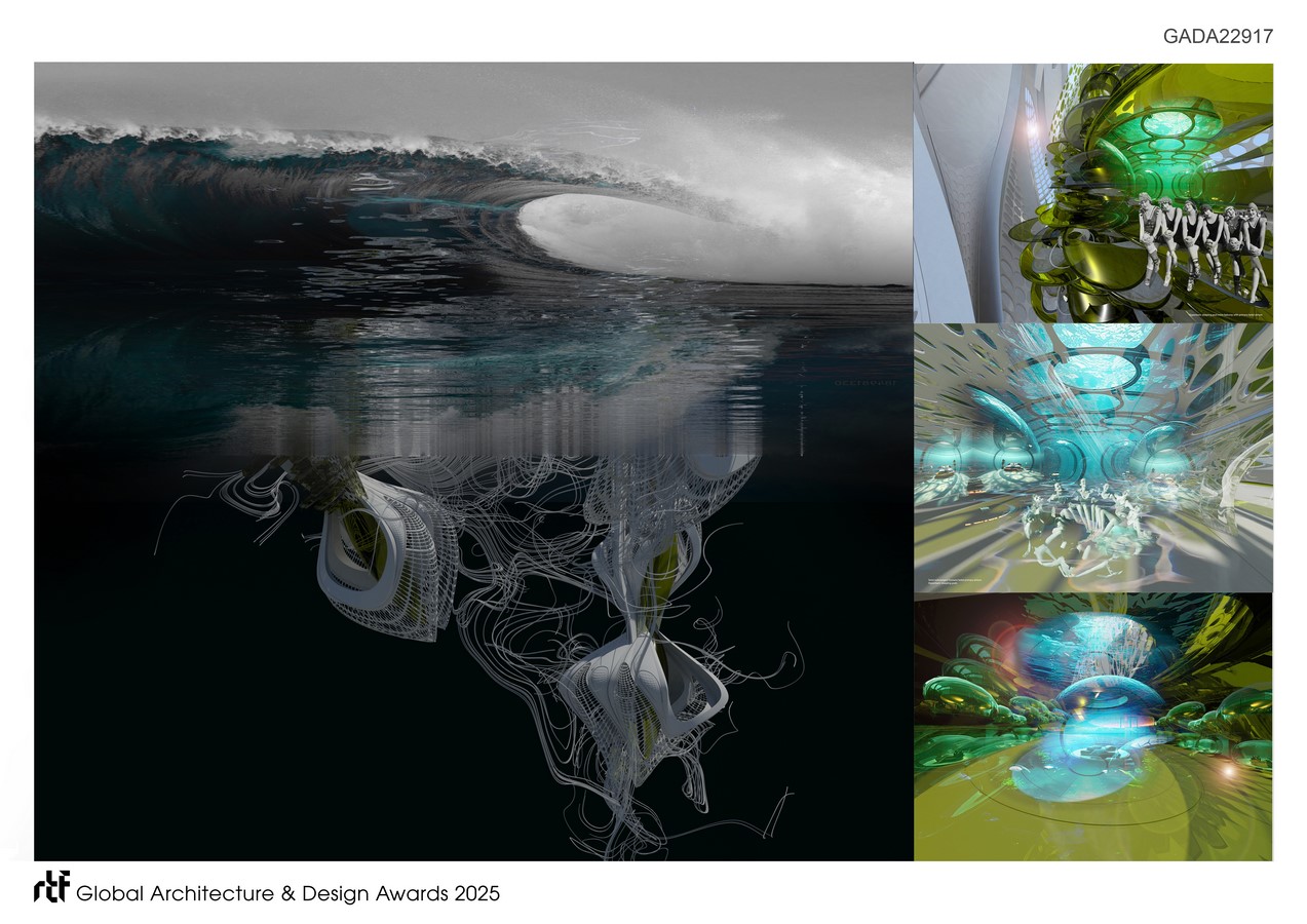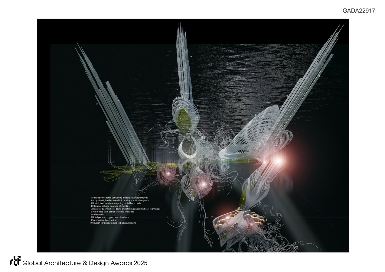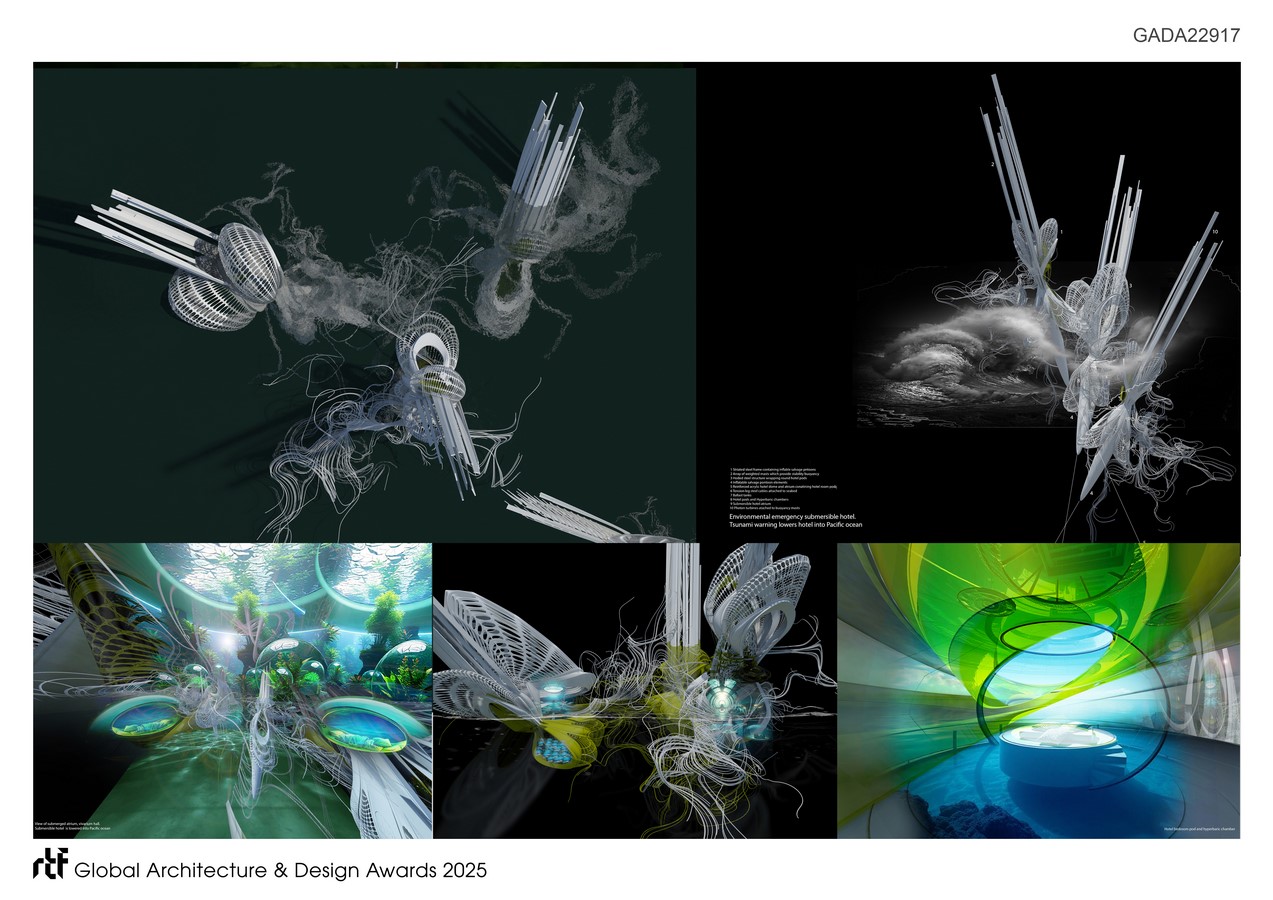 The hotel’s vertical structures can submerge into the depths of the Pacific Ocean to avoid the impact of a tsunami. The design draws inspiration from floating pontoons, buoys, sleeping humpback whales, and submersible vessels, as well as vertically moored tension leg oil rig platforms.