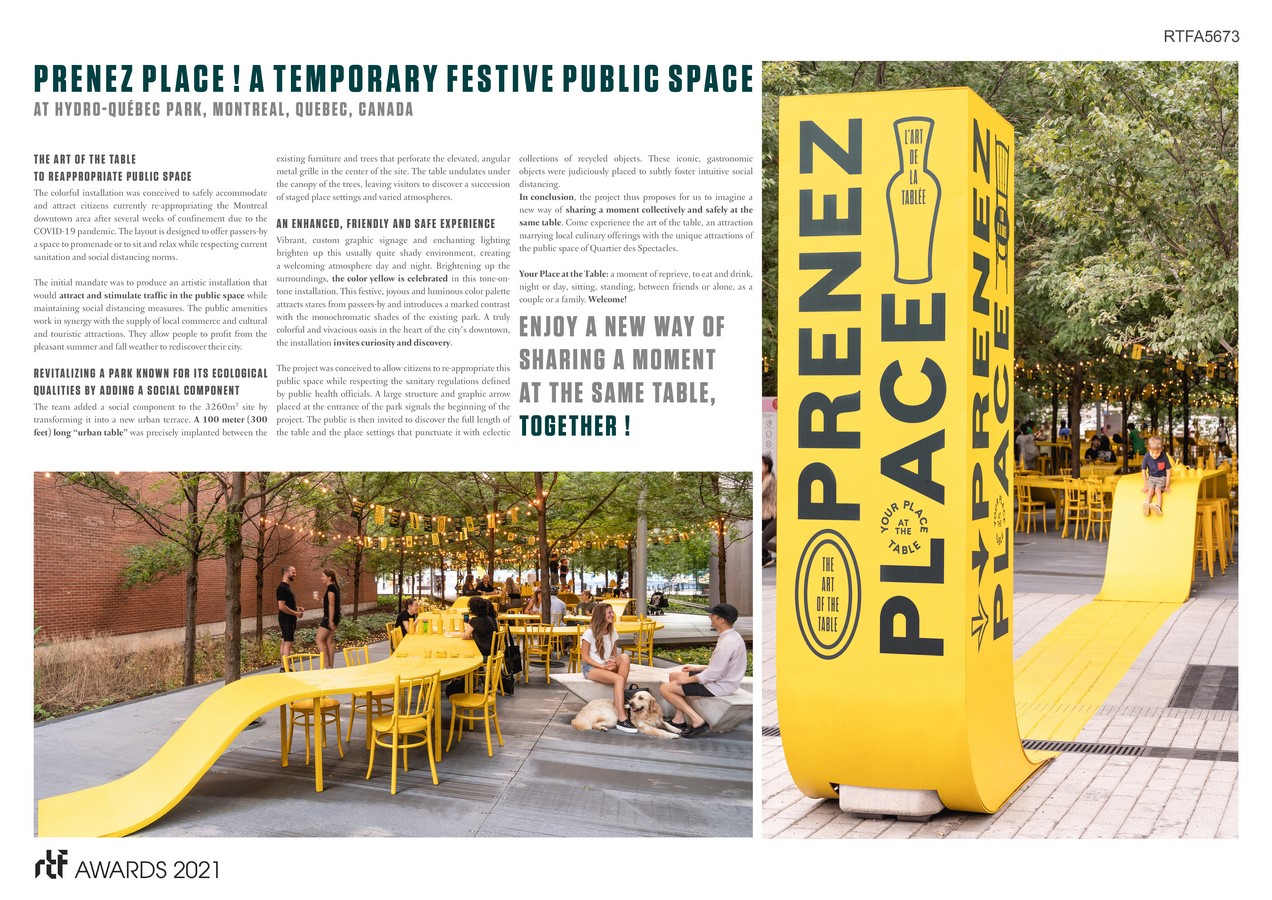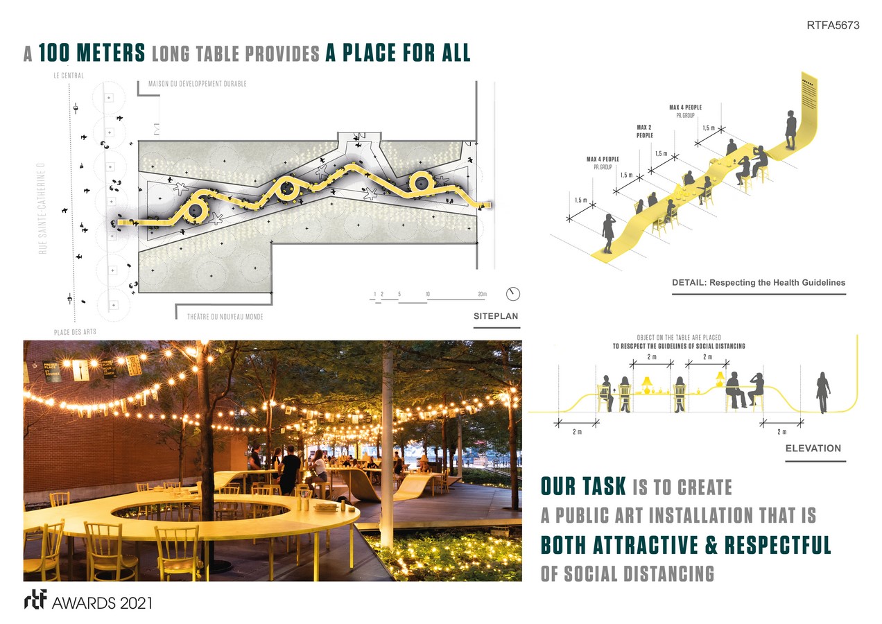 In conclusion, the project thus proposes for us to imagine a new way of sharing a moment collectively and safely at the same table. Come experience the art of the table, an attraction marrying local culinary offerings with the unique attractions of the public space of Quartier des Spectacles.