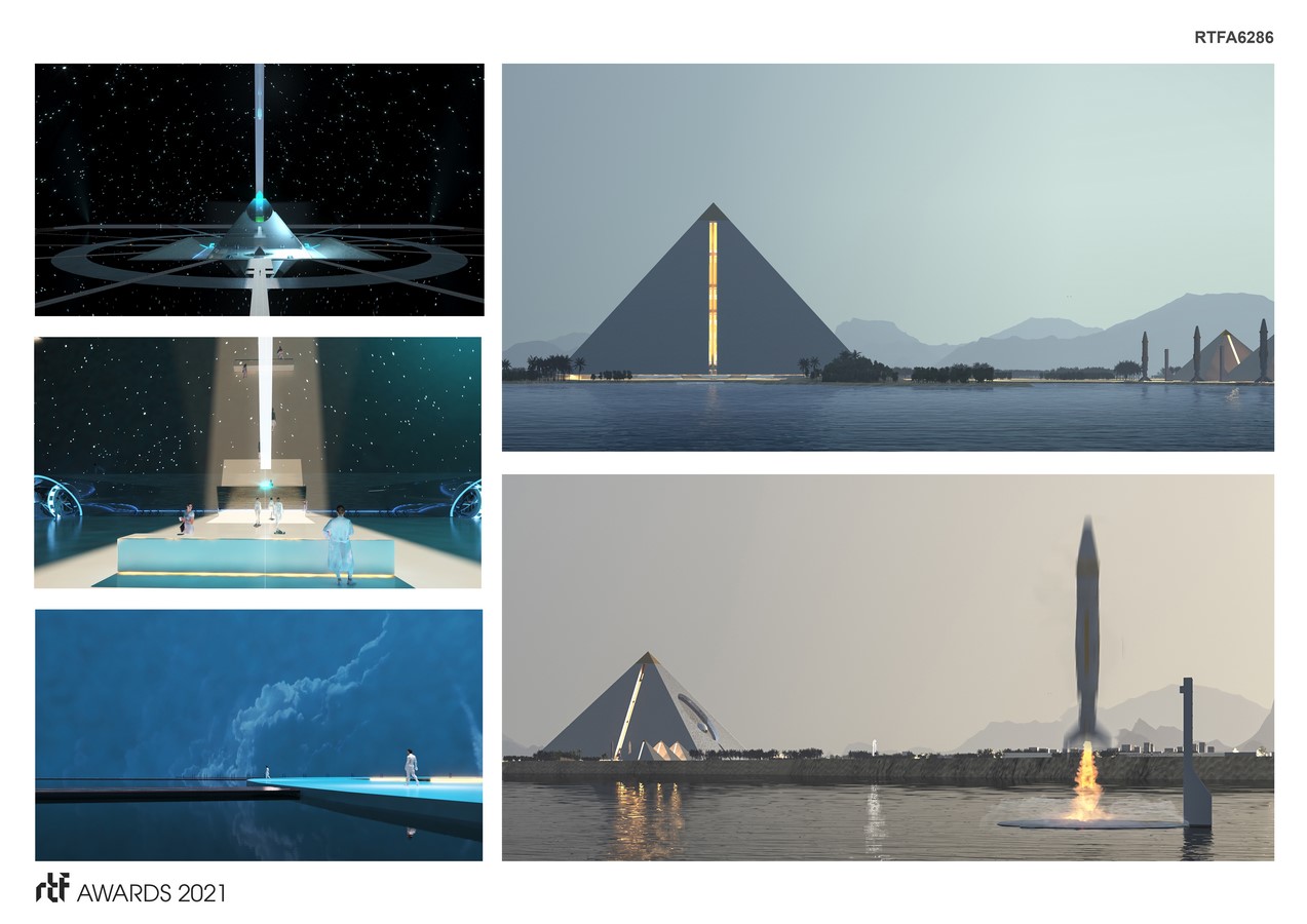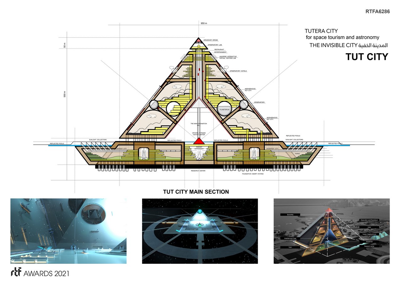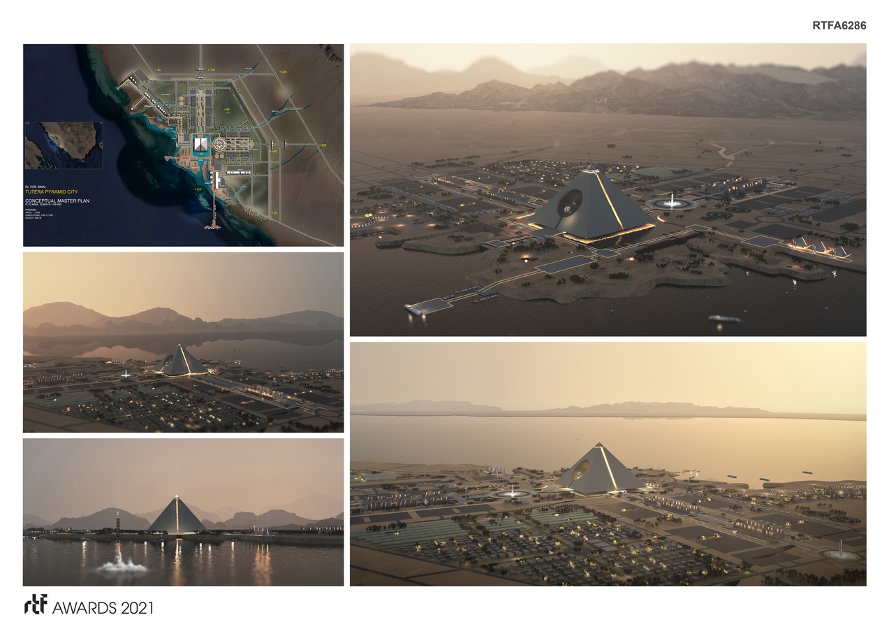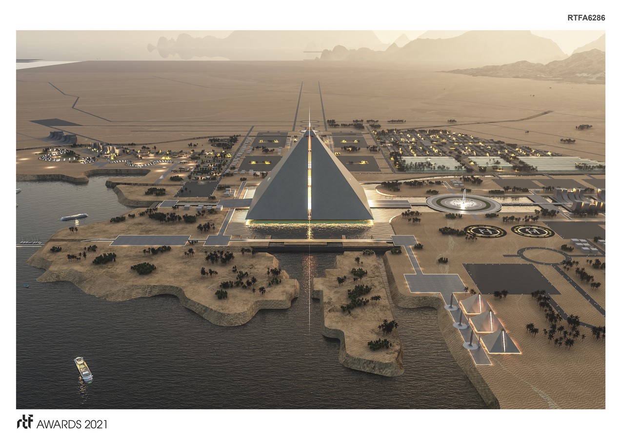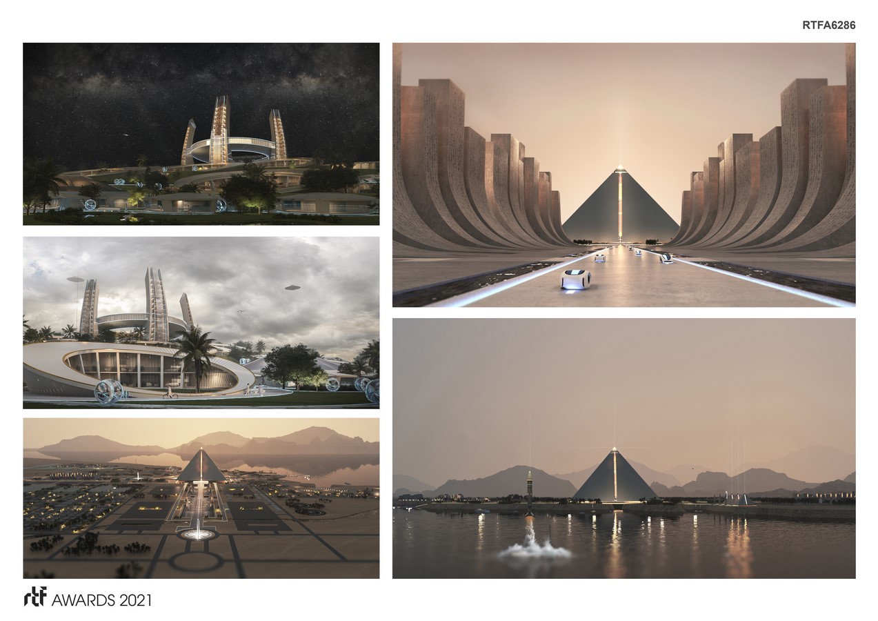The city’s design idea is based on being a world-class tourist city, and what makes it a unique city is that it is the first city based on outer space tourism. The planning idea of the city is based on creating major axes that reach the city center and its main building and these axes perpendicular to the four original directions indicating The ancient Egyptians were among the first to work in astronomy, understood it, and showed their knowledge and strength in their architecture. On the main city axes, a group of multi-use buildings are lined up in preparation for the main building in the city center, which is a pyramid-shaped building that dominates the city. Taking the visitor on a journey to the ancient Egyptian times with all the sciences, ethics, art and architecture they represent. The city also includes a hotel tourist area overlooking the surrounding beaches, in addition to an integrated residential village – with all its services – for workers in the city.