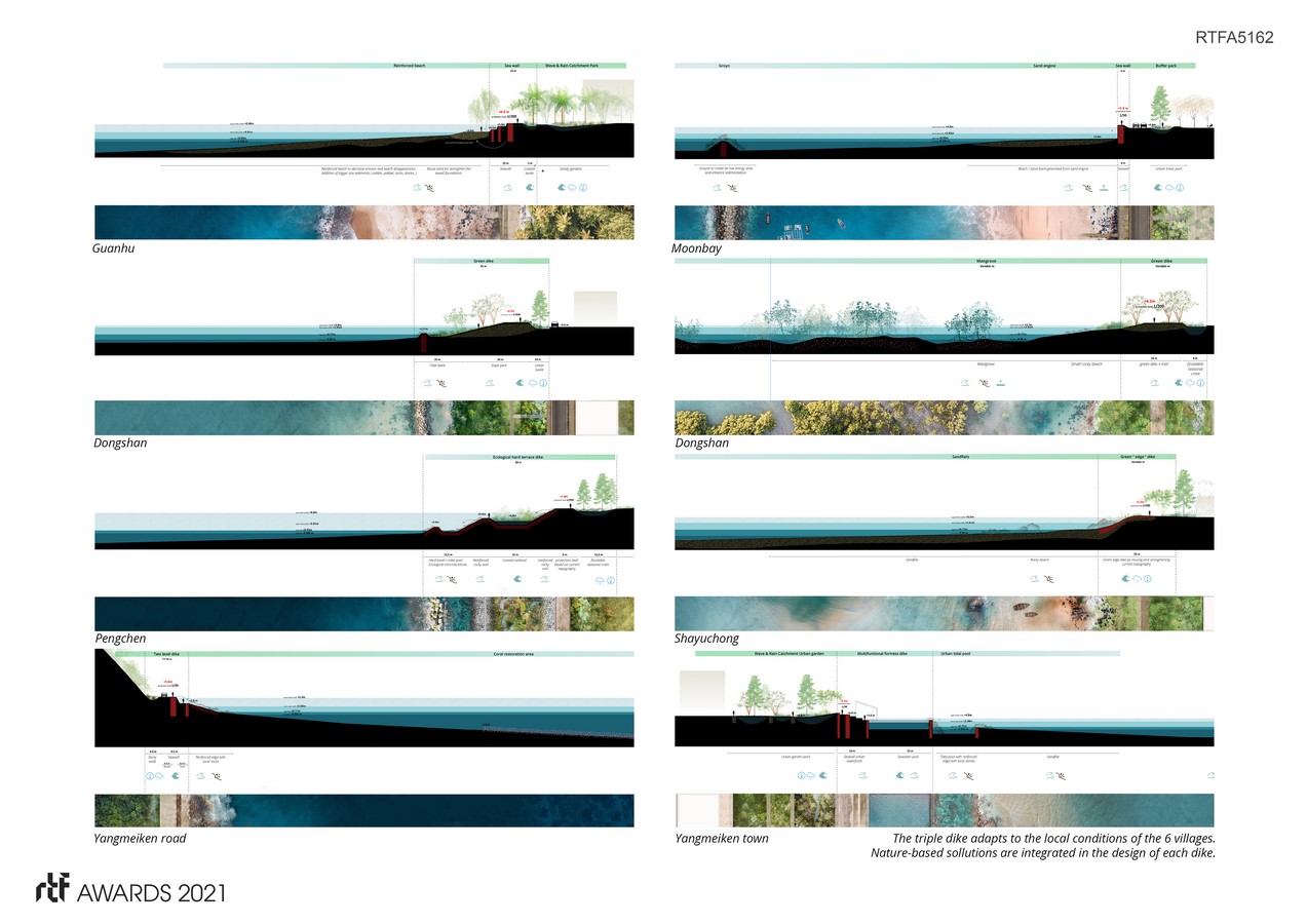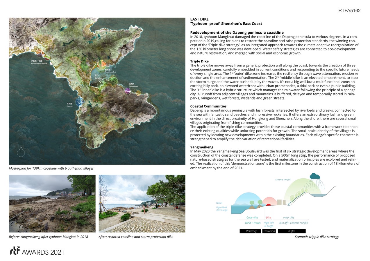 In 2018, typhoon Mangkhut damaged the coastline of the Dapeng peninsula to various degrees. In a competitionin 2019,calling for plans to restore the coastline and raise protection standards, the winning concept of the ‘Triple dike strategy’, as an integrated approach towards the climate adaptive reorganization of the 130 kilometer long shore was developed.