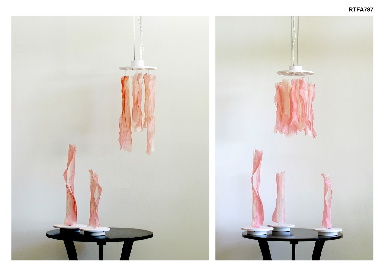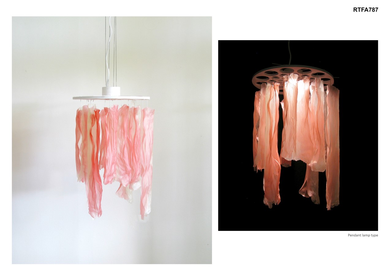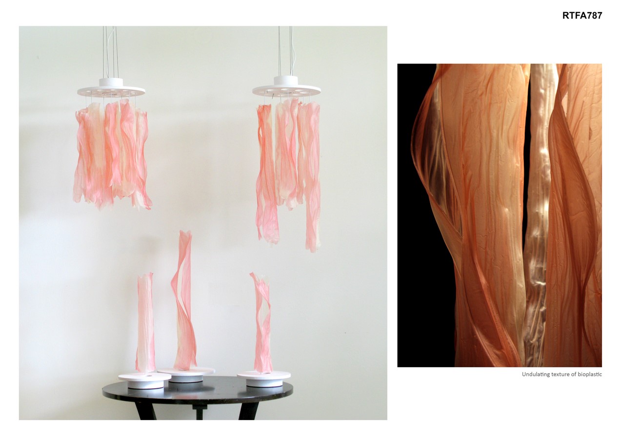 Undulae is a series of table and pendant lamps made of cornstarch-based bioplastic tubes. Bioplastic is made from the mixture of cornstarch, water, vinegar and glycerin with a particular proportion and mixing process.