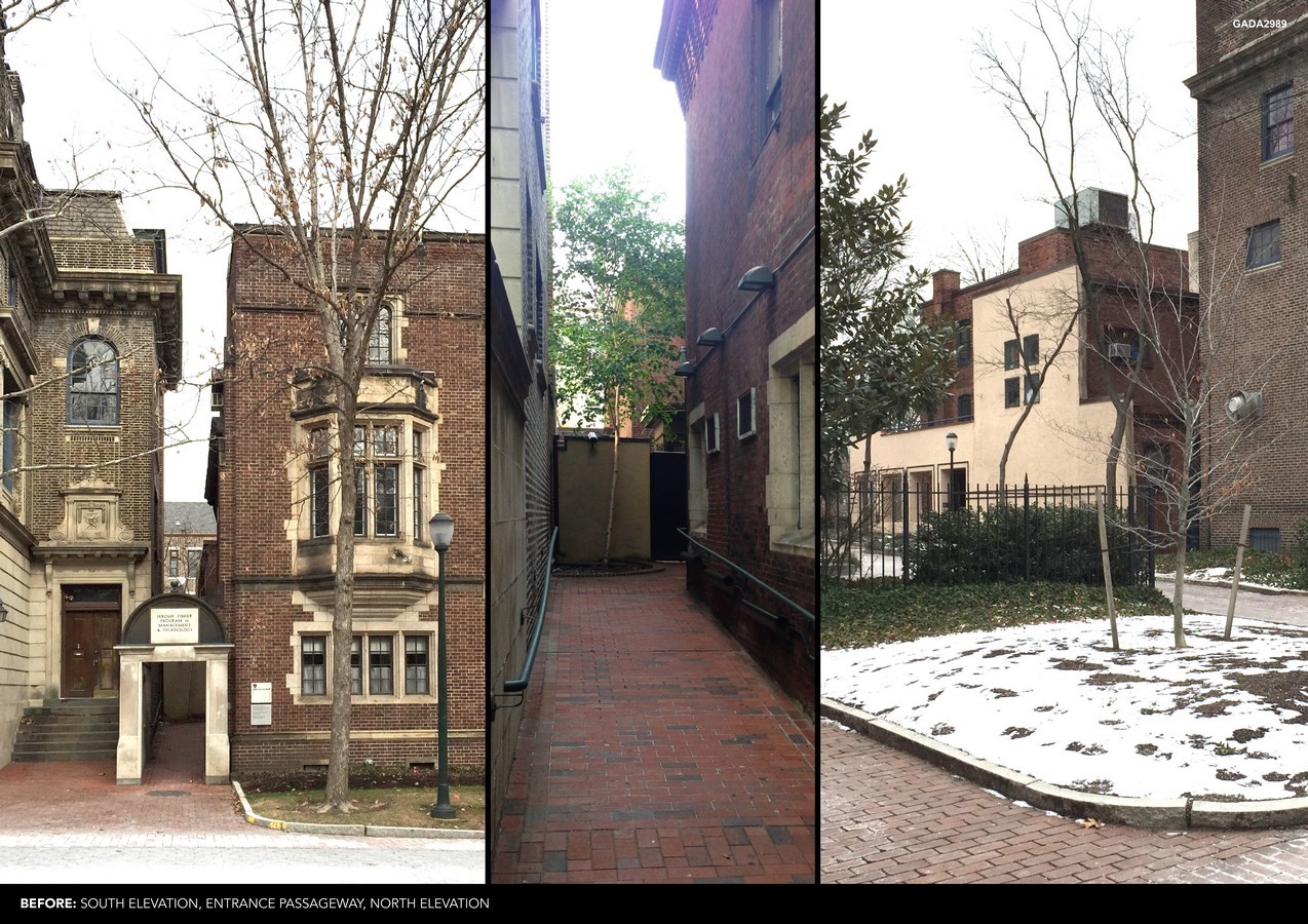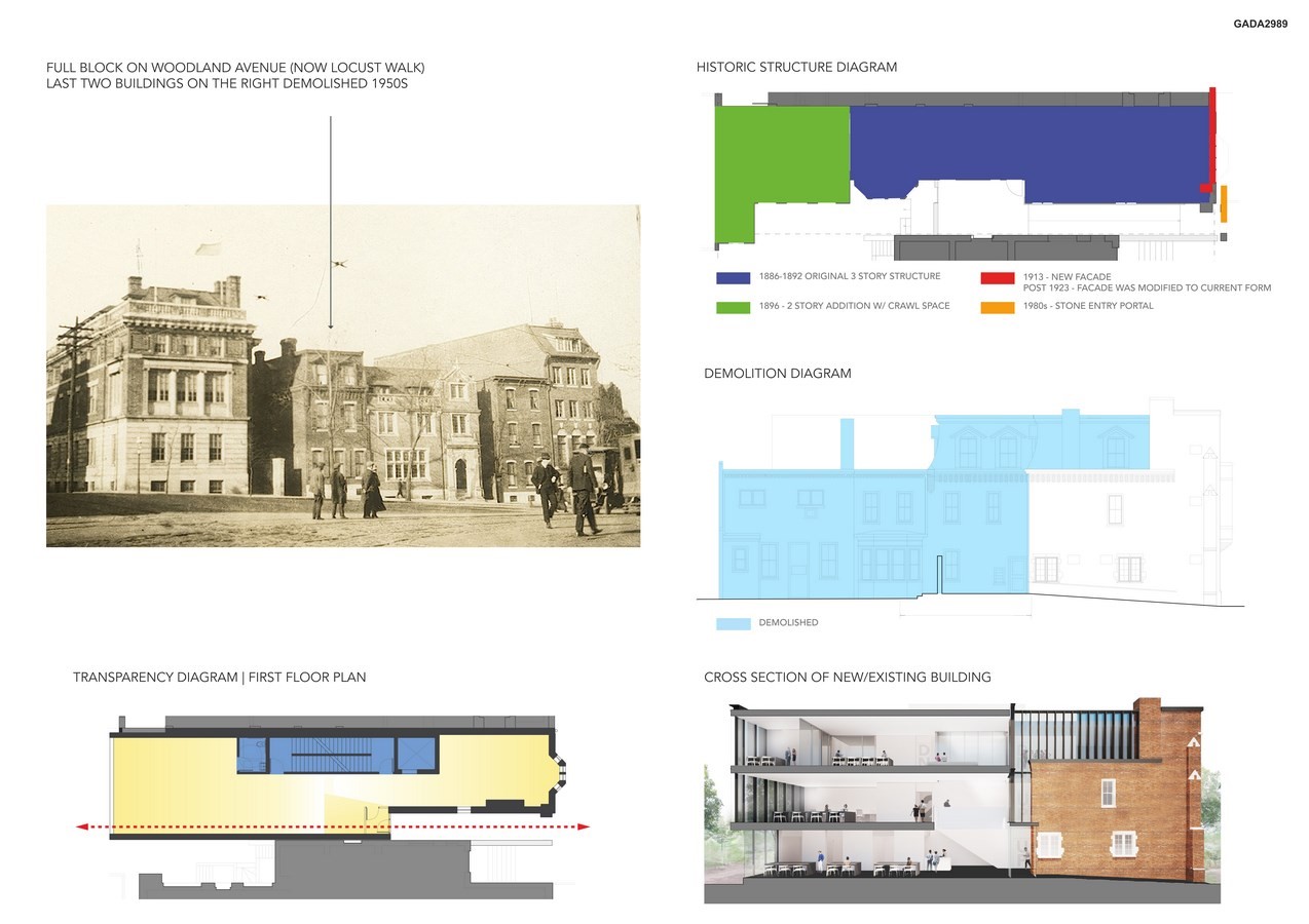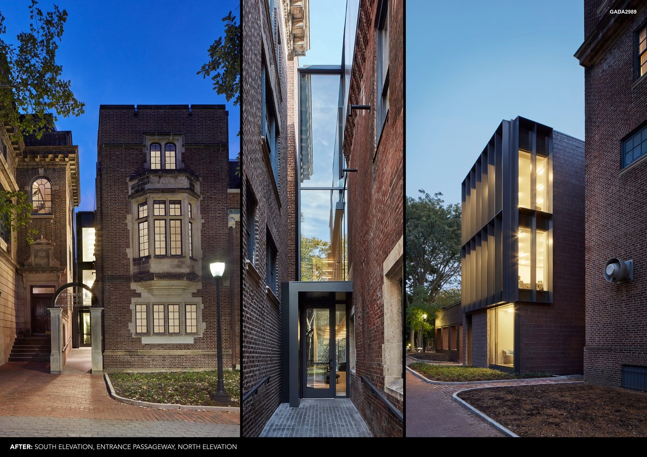 Originally constructed as a residence in the late 1800s, the building served various uses and underwent multiple renovations in differing architectural styles. Among these interventions are the 1920s Academic Gothic façade replacing in part a French mansard in the front and a Postmodern, stucco façade that combined the building with its neighbor at the rear. An extremely tight site sandwiched between two Historic Landmark buildings made construction difficult, forcing surgical tactics as part of a careful strategy for historic preservation.