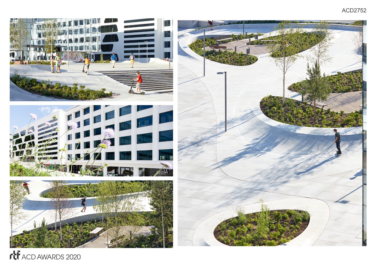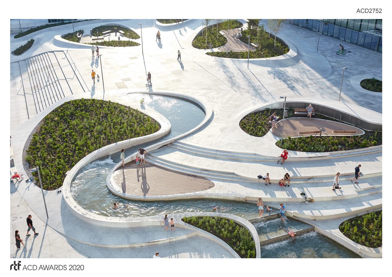This hybrid of skate park, playground & urban living room is the perfect venue for a young, dynamic society. What was previously a largely unused is now a new, inviting public space where you can casually enjoy a coffee or work outdoors while the kids play in the water, youths skate & students relax in the sun…
