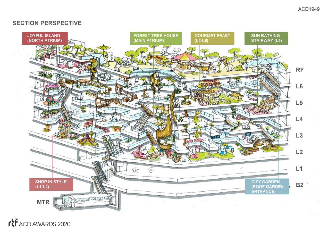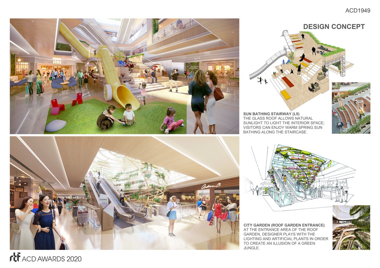 Diverse retail programs are separated and located at different floors and sections with highly innovative natural scenes as the partition theme, providing visitors an exciting “urban garden tour”.
