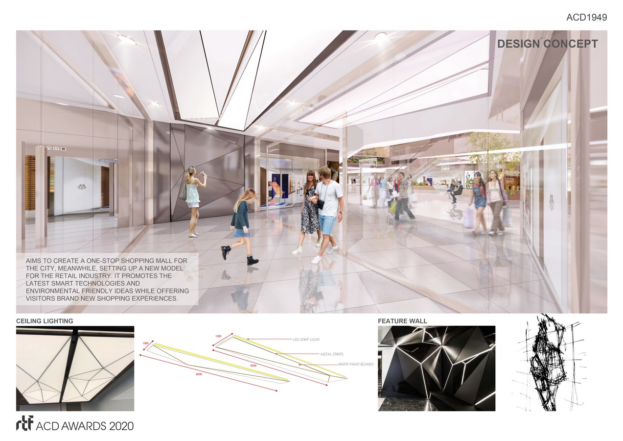 The tree-branch style polyline element was developed to become the theme to tie the main atrium and its ceiling all together. The interaction between people and space was therefore created by the layers. Balconies at different floors trace an interesting outline for the atrium; selected retail tenants at the balconies will draw visitors’ attention, making them curious to explore around. The simple and classic floor design with selected materials not only presents the polyline concept but also works as a pattern to guide people.