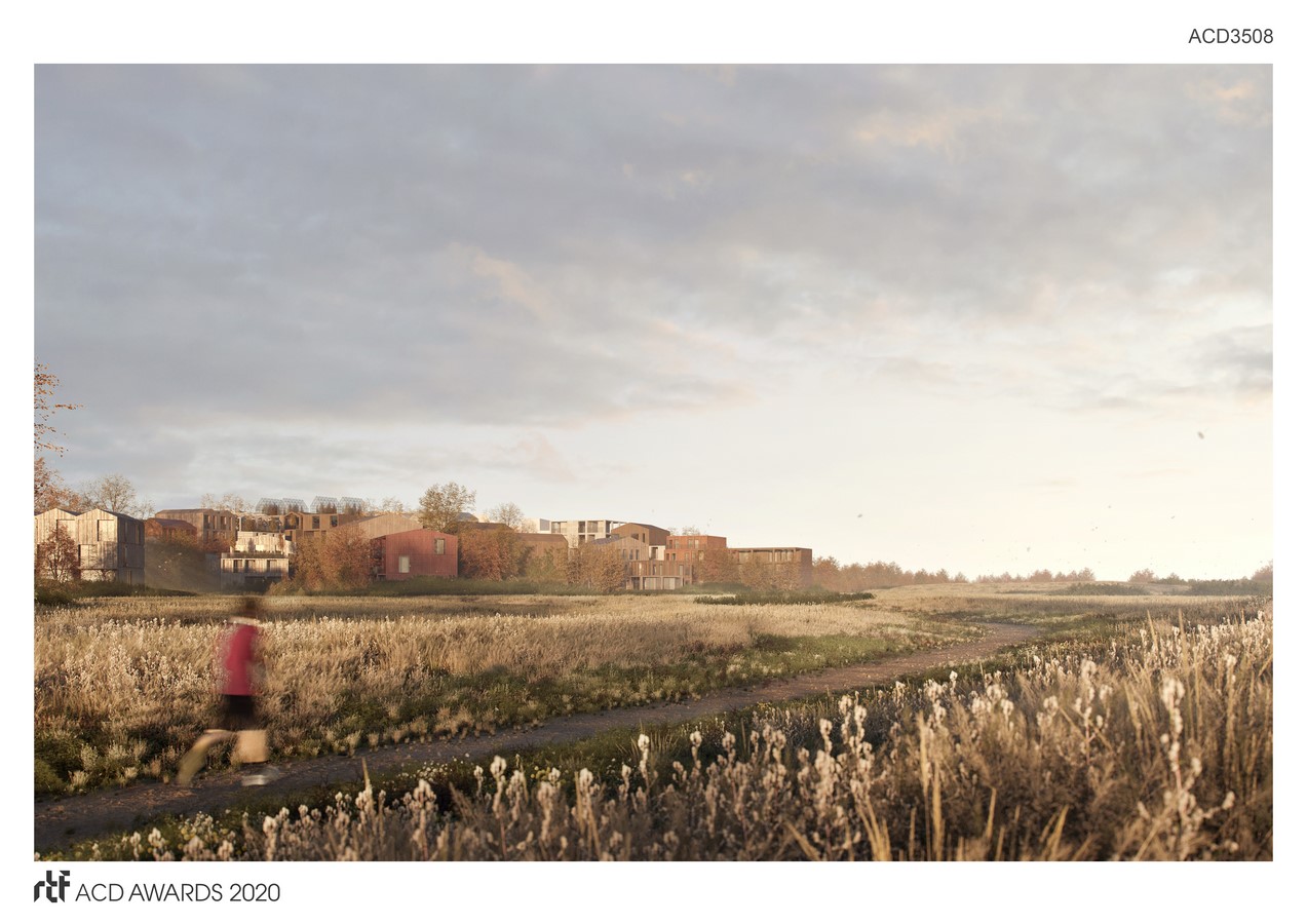 Developed in collaboration with biologists and environmental engineers from MOE, the scheme preserves 40 percent of the 18.1 hectare project site undeveloped habitat for local flora and fauna. Green corridors draw the surrounding landscape into the masterplan, dividing the development into three smaller enclaves. These corridors allow residents increased and direct access to nature, but more importantly, allow the animal species of Amager Fælled to move freely through and within the area.