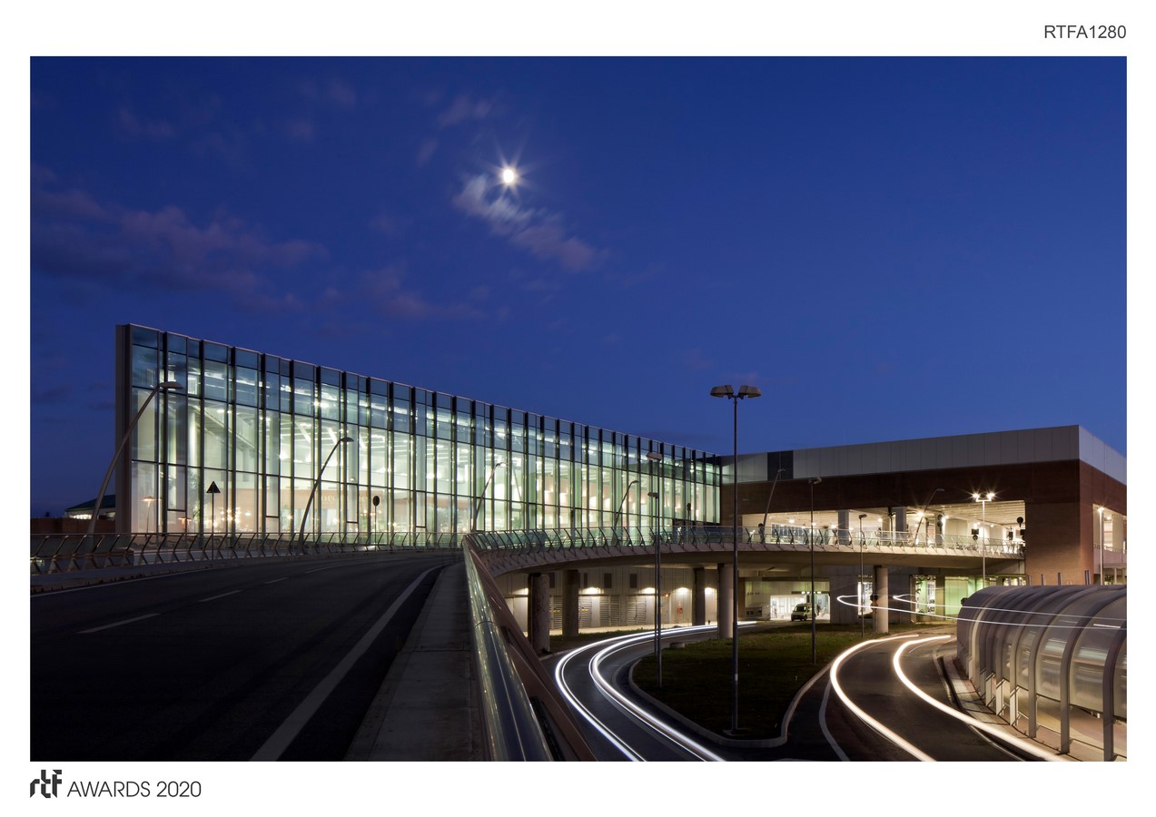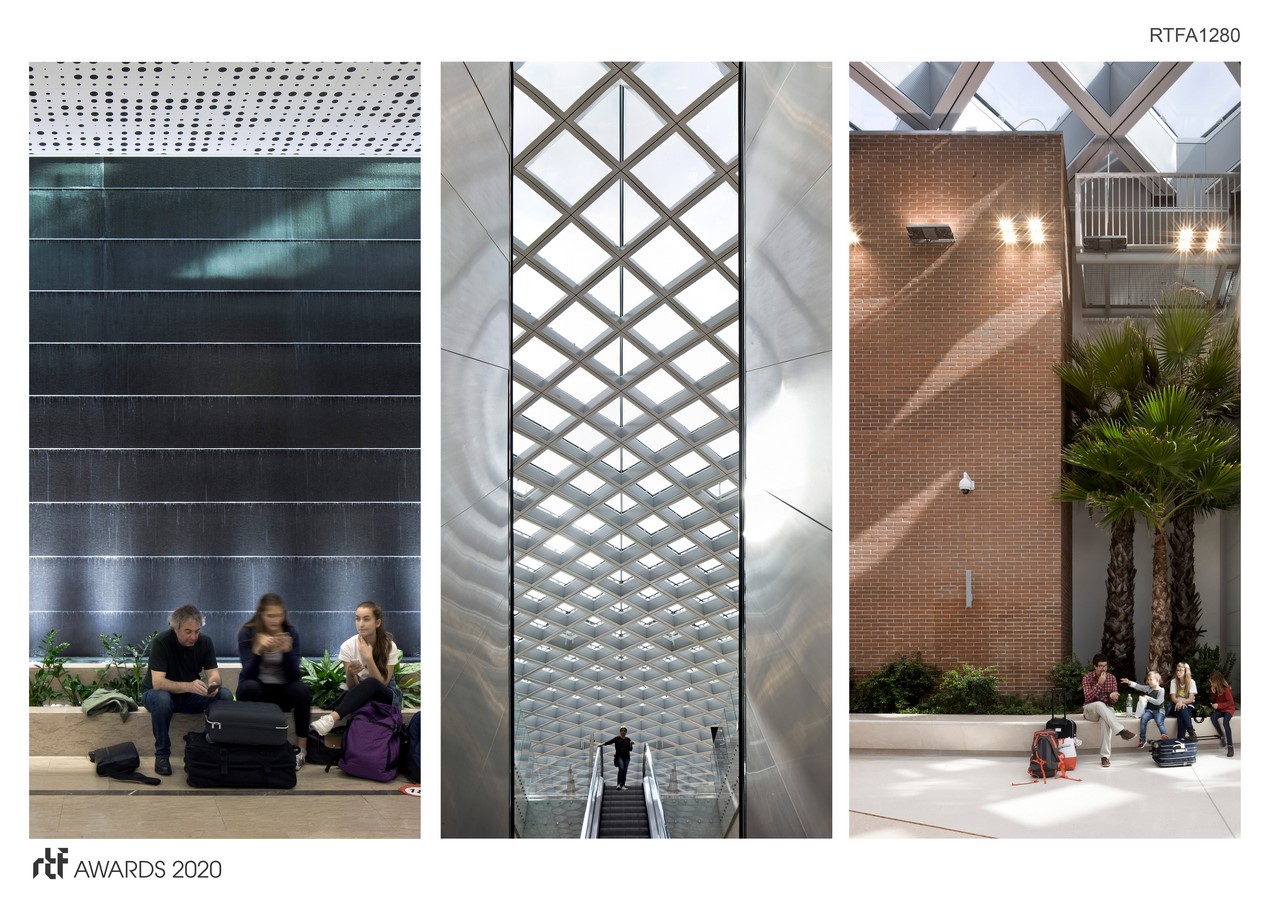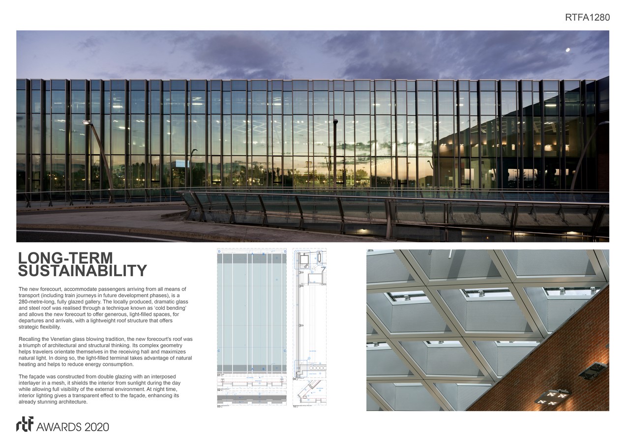The new forecourt, which will accommodate passengers arriving from all means of transport, is an 280-metre-long, fully glazed gallery that takes advantage of the 22-metre-wide interstitial space left available from the original complex between the terminal and the dual level road. This allows the new forecourt to offer generous, light-filled spaces, for departures and arrivals, with a lightweight roof structure that offers strategic flexibility.