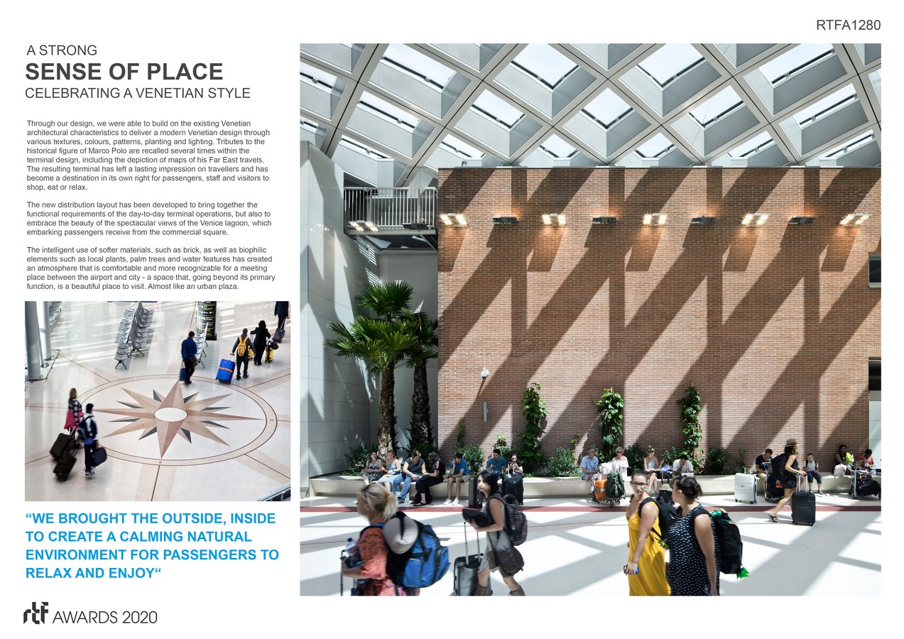 The new distribution layout has been developed to bring together the functional requirements of the day-to-day terminal operations, but also to embrace the beauty of the spectacular views of the Venice lagoon, which embarking passengers receive from the commercial square. As a result, we have created a harmonious dialogue between the original airport buildings and the new extensions, ensuring that the iconic lagoon landmark is expanded sustainably, now and in the future.