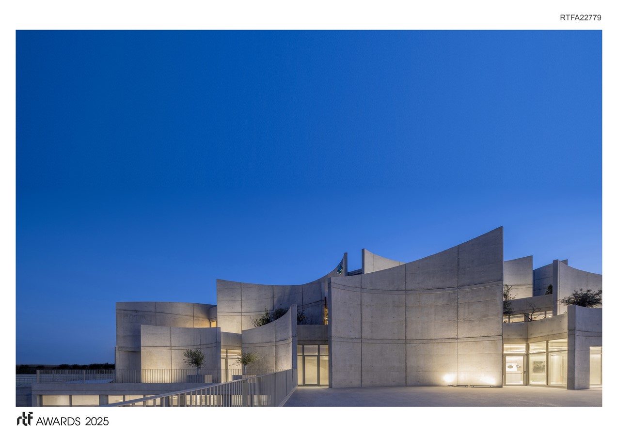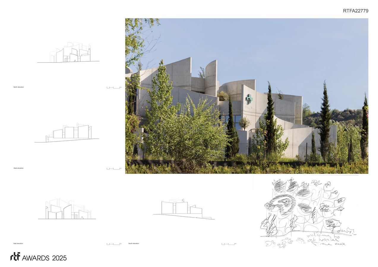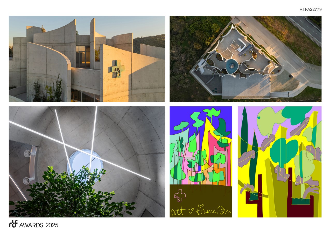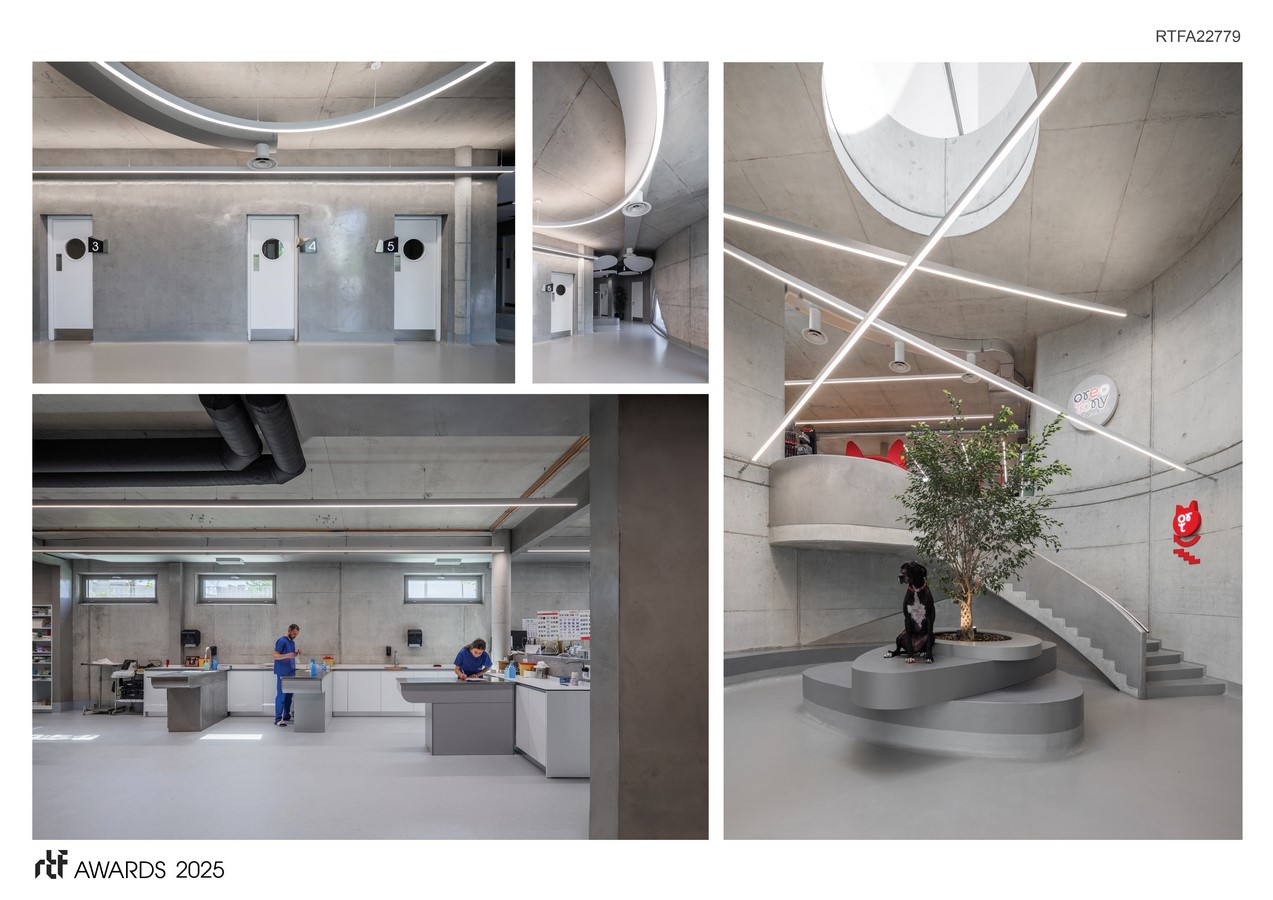 The interplay between the gentle curves and the rawness of exposed concrete brings strength and sensitivity to the design. Terraces and gardens are not ornamental—they are therapeutic, offering light, air, and connection to nature. Internally, the space is crafted with psychological awareness: just as in human healthcare, different species—especially natural adversaries—require thoughtful spatial separation and comfort. The layout reflects this sensitivity, creating an environment of calm and control.