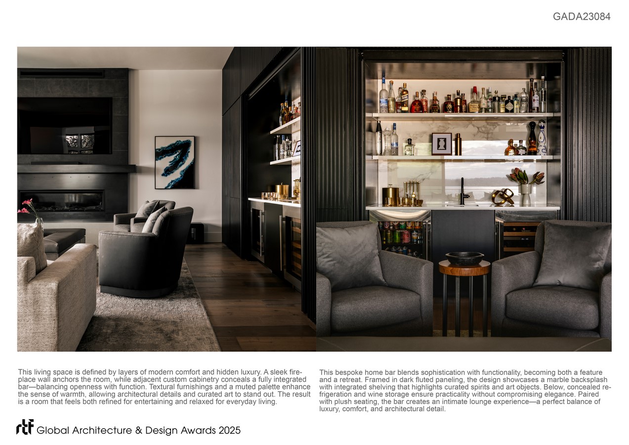 Special attention was given to moments of luxury integrated seamlessly into the design. A concealed home bar, framed in dark paneling with marble accents, transforms entertaining into a curated experience. Every detail—from concealed storage to intimate lounge groupings—was designed to serve both function and lifestyle.