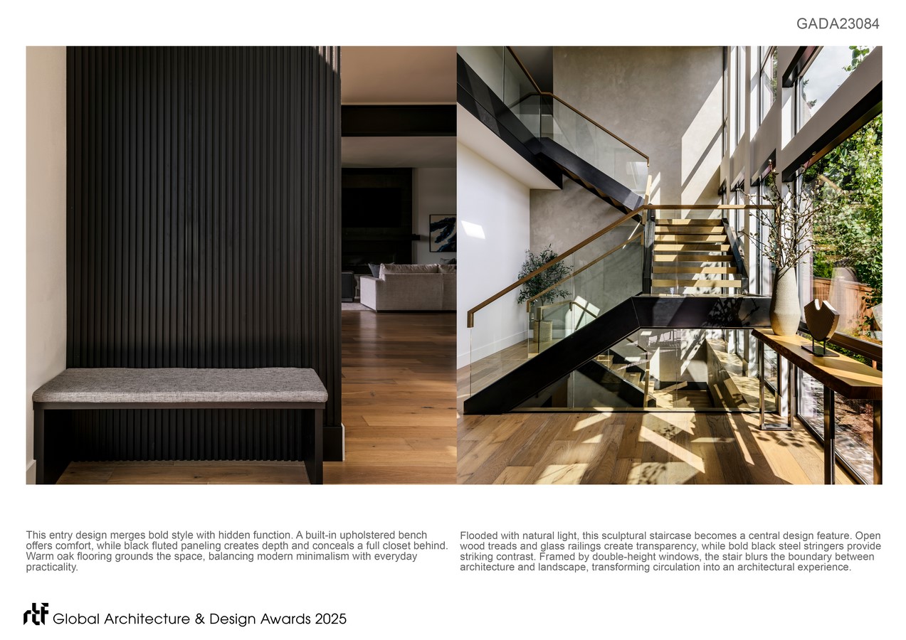 From the moment of entry, the design establishes a dialogue between bold architectural gestures and thoughtful detailing. Vertical black fluted paneling defines the foyer, concealing functional storage while framing a built-in bench for everyday use. Beyond, a sculptural open-riser staircase rises in front of double-height windows, transforming circulation into an architectural centerpiece animated by shifting light throughout the day.