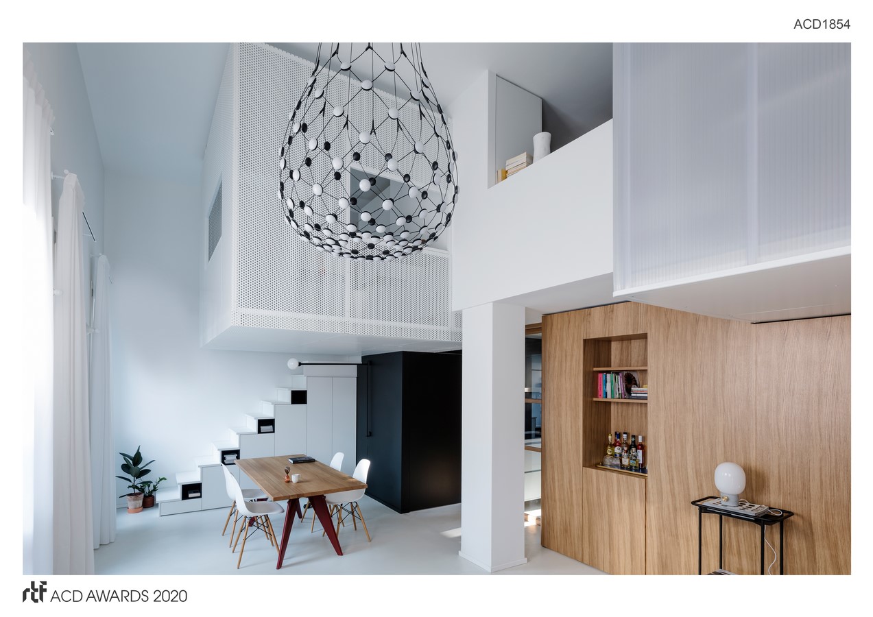 The project transforms a traditional two-rooms apartment into a loft, taking advantage of the generous height of the site.