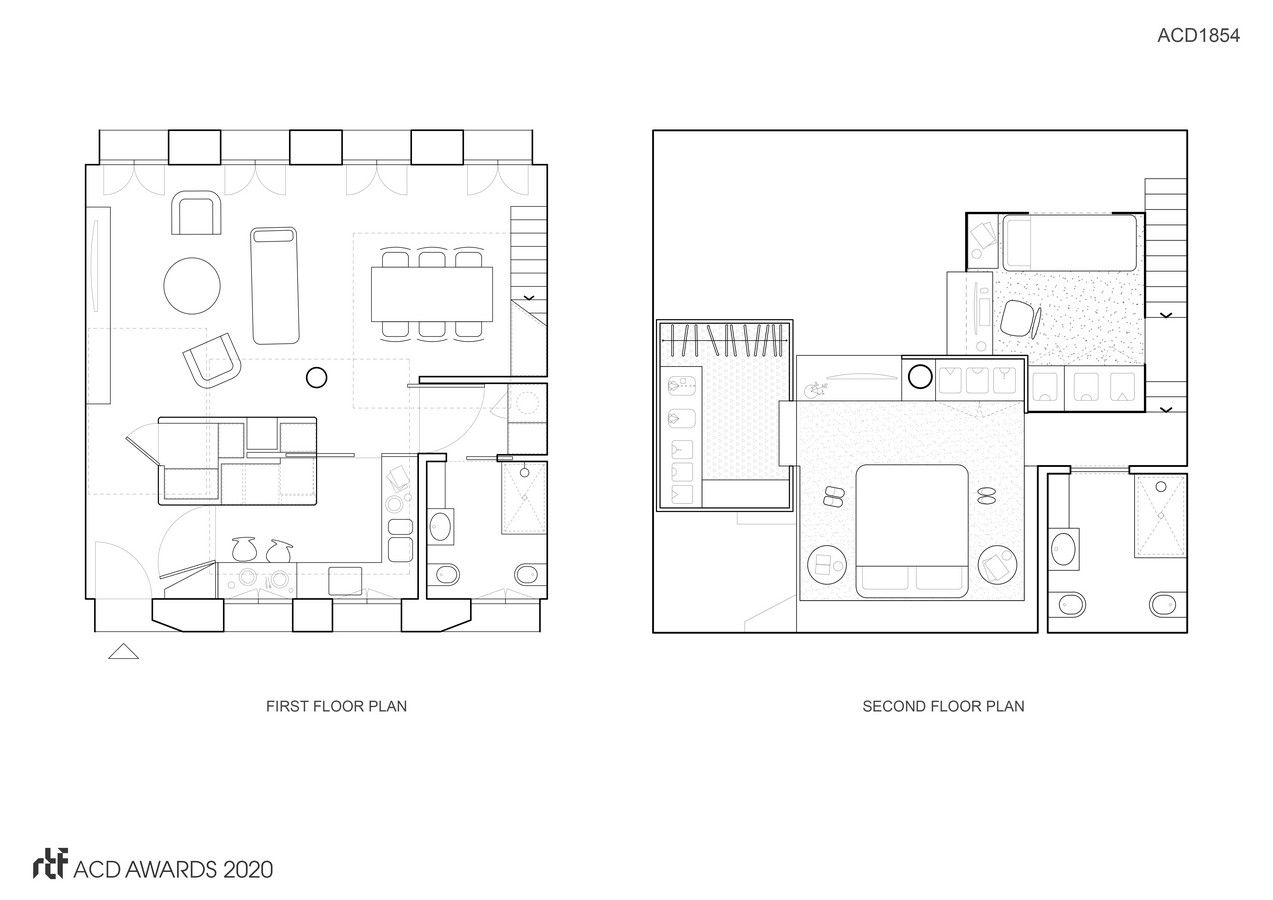 This way, the walk-in closet, the second bedroom and the second bathroom become three characters, each with different material “skin” texture; among these the master bedroom is set as a safe shelter.