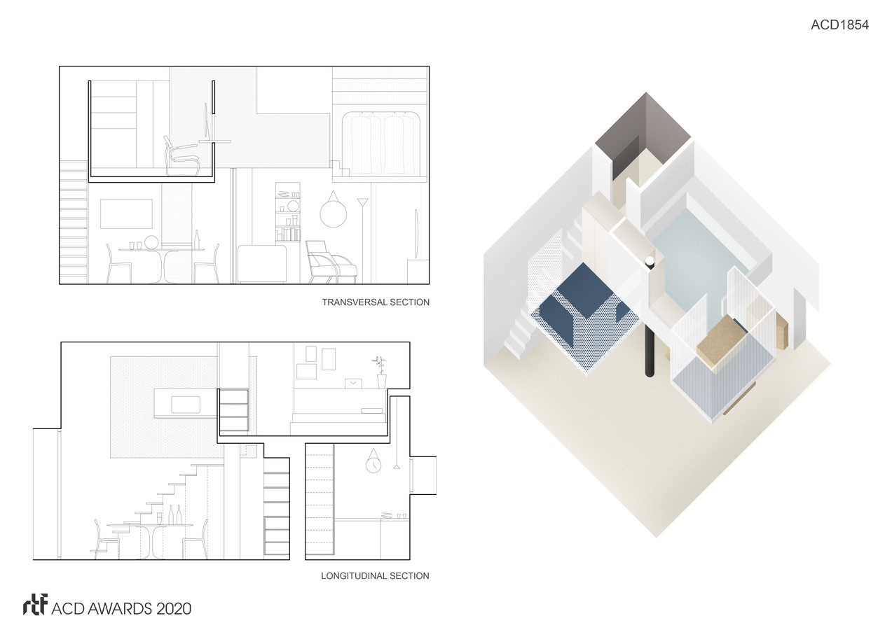 The aim of the project is to transform a traditional two-rooms apartment in a complex loft-like space, through a system of suspended volumes.