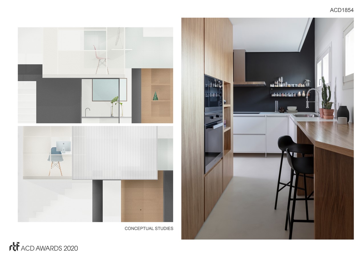 The 55 sqm surface is multiplied thanks to a mezzanine, through a composition of suspended volumes, almost doubling in size.