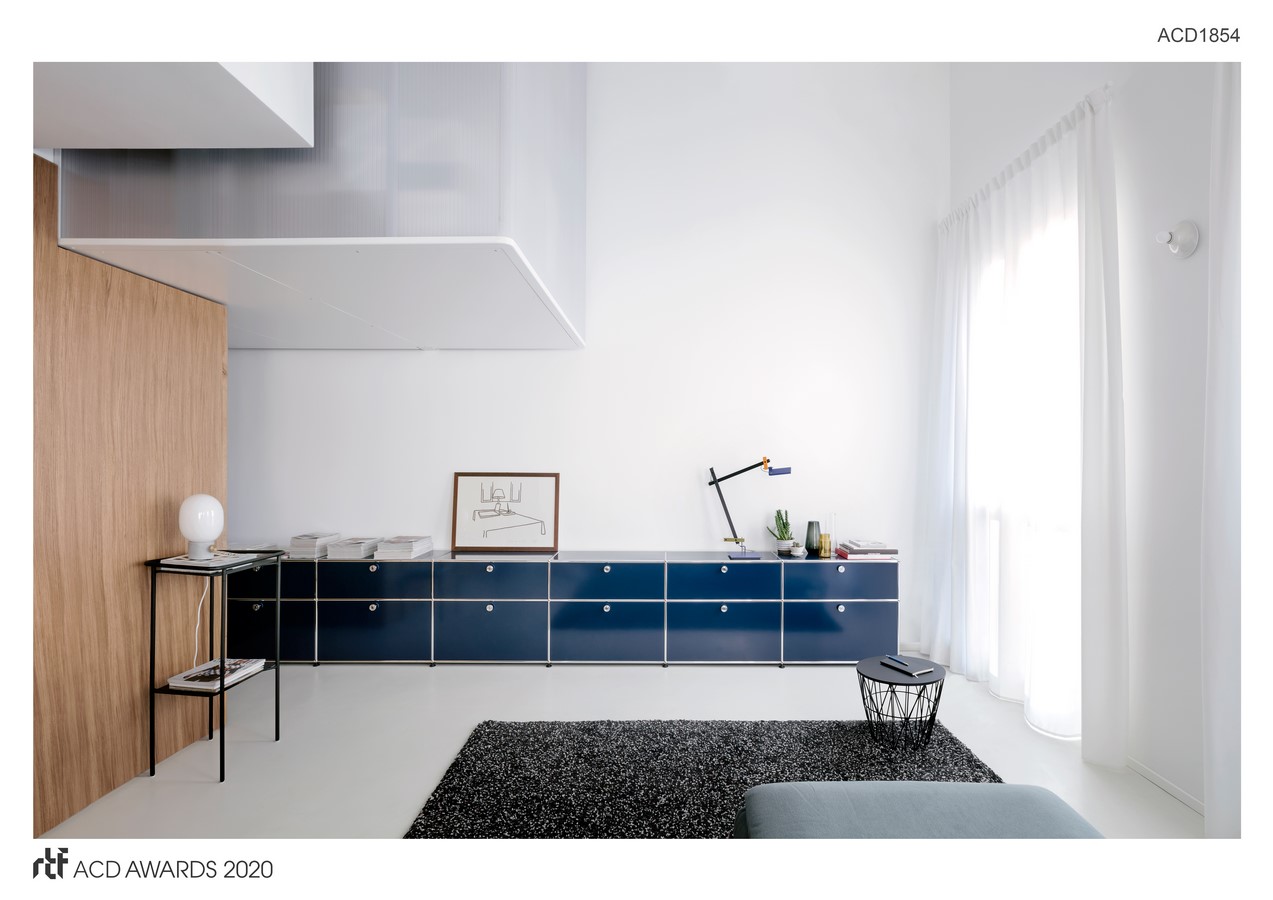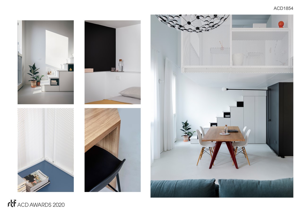 The use of different highly permeable materials (polycarbonate, perforated sheet metal) guarantees a visual dialogue between the rooms and this creates an overall perspective on volumes composition in every part of the apartment.
