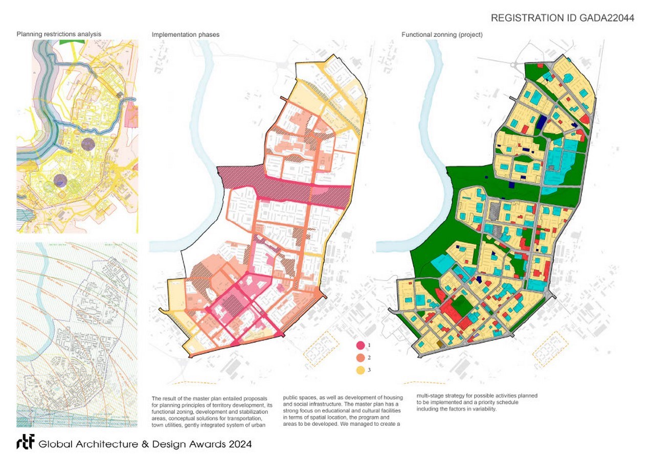 The result of the master plan entailed proposals for planning principles of territory development, its functional zoning, development and stabilization areas, conceptual solutions for transportation, town utilities, gently integrated system of urban public spaces, as well as development of housing and social infrastructure. The master plan has a strong focus on educational and cultural facilities in terms of spatial location, the program and areas to be developed. We managed to create a multi-stage strategy for possible activities planned to be implemented and a priority schedule including the factors in variability.