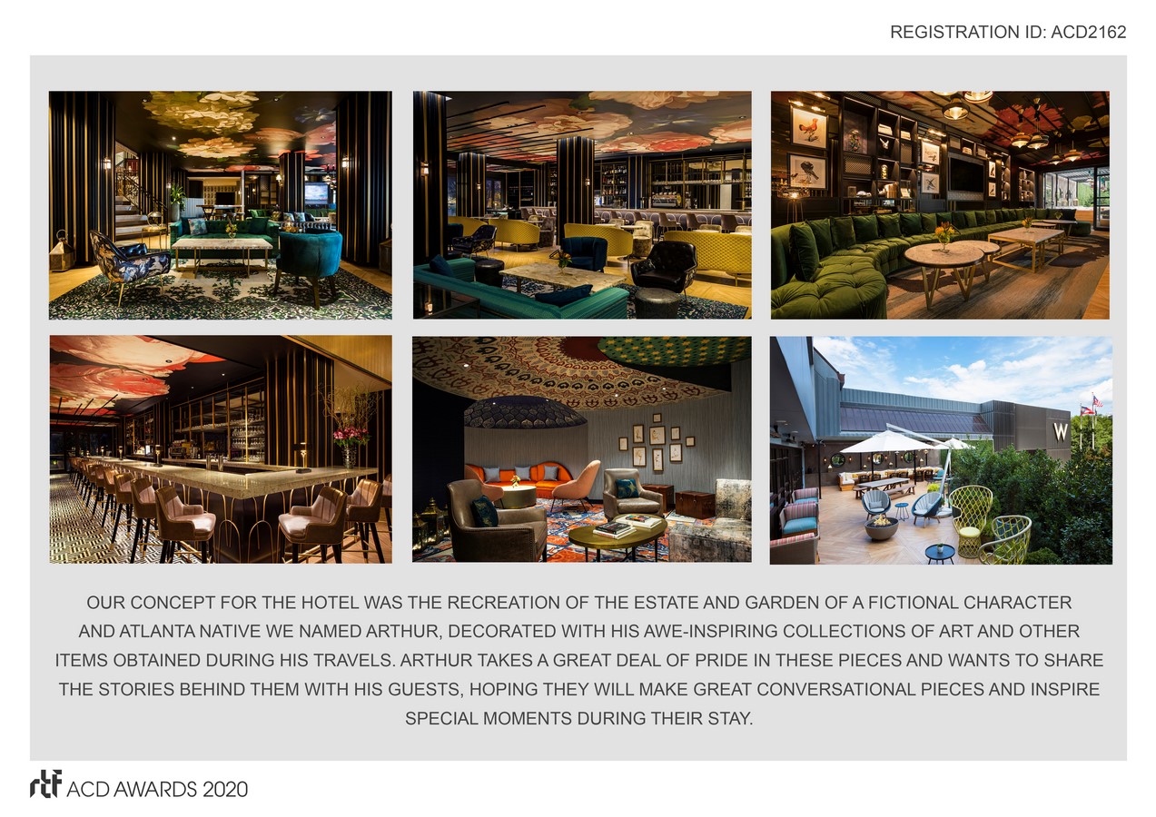 The client objective was to cater to a different guest clientele, to skew to a crowd full of flair and sophistication. The space reveals this new guest experience with depth and layering. We worked with the architect to create a double entry that opened the space so guests can see directly into the lobby, where they are transported in our fictional character Arthur’s unique world.