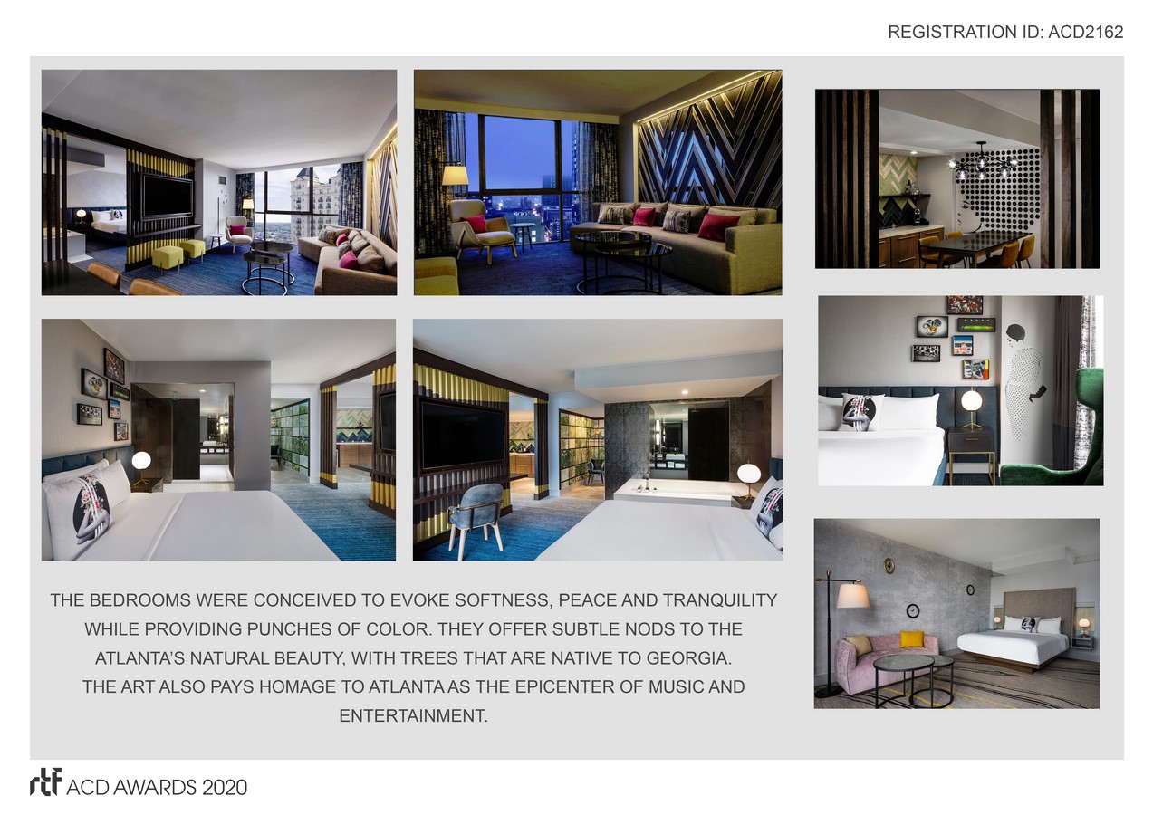 Our firm created all artwork in the guestrooms and suites in collaboration with a Paris-based art consultancy. The guestrooms are an extension of our character’s hospitality. We reconfigured the spaces to be more open and three-dimensional so guests can relax or entertain and not feel cramped. The bedrooms were carefully conceived to evoke softness, peace and tranquility while providing punches of color, transporting visitors to another place and experience. They also offer nods to the Atlanta’s natural beauty, with trees that are native to Georgia.