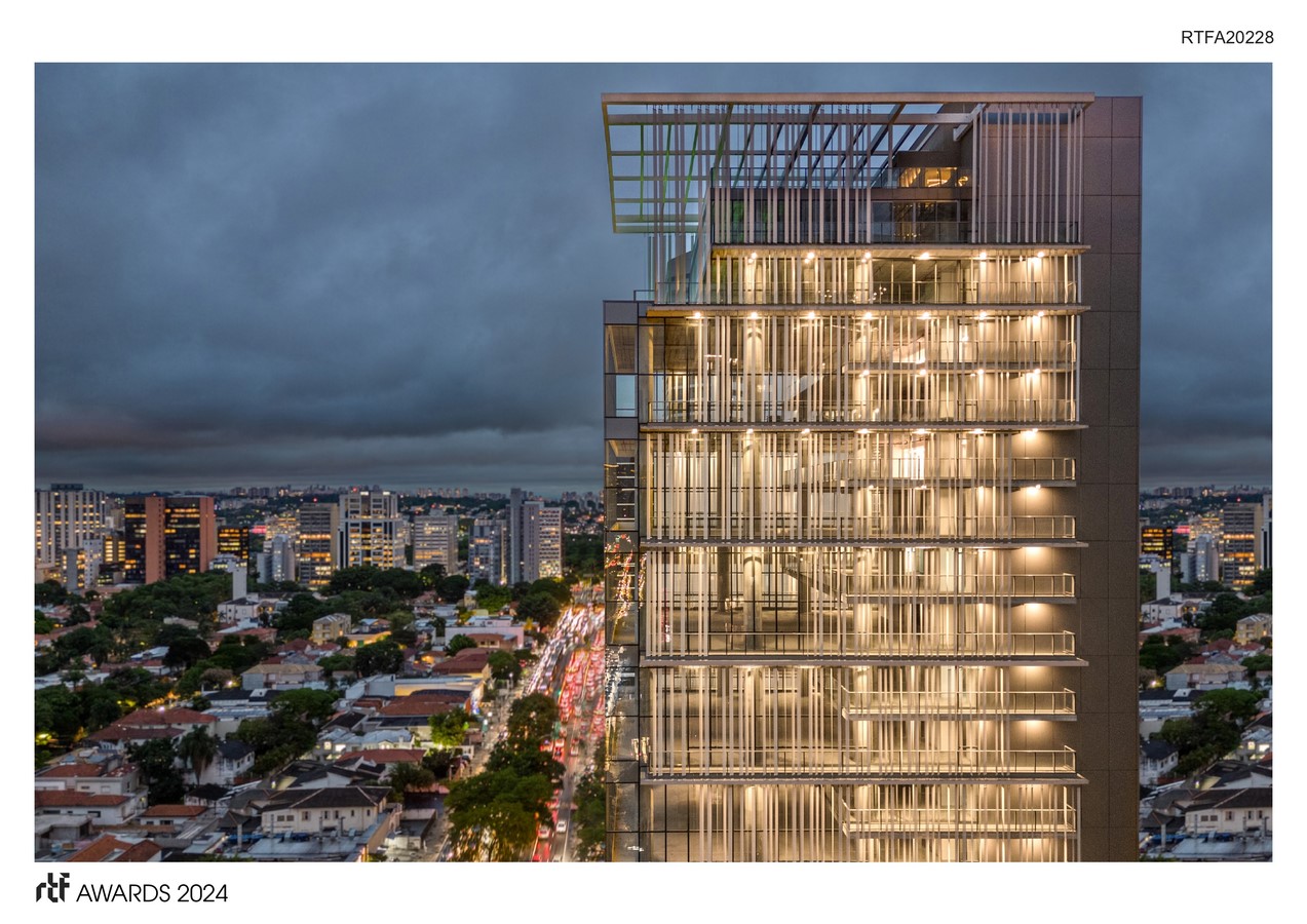 With 22 corporate floors and double-height spaces of nearly 6 meters, the tower provides a stunning view of the Jardins neighborhood. The design prioritizes vertical expansion while maintaining floor area, offering a unique perspective from the first floor at tree level.