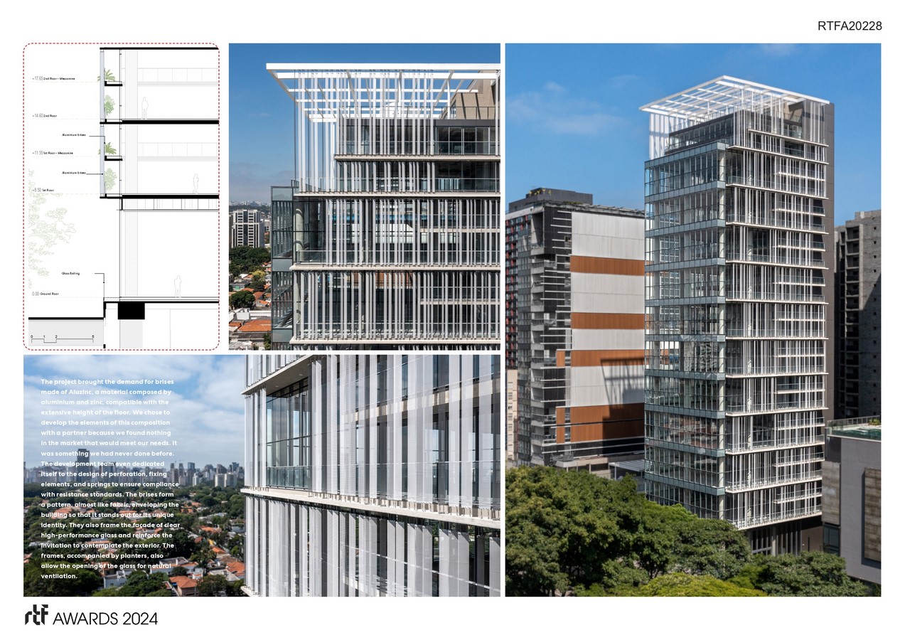 Authorial metal brises made of Aluzinc envelop the building, forming a unique pattern, framing clear high-performance glass, and facilitating natural ventilation. The choice of treated exposed concrete for finishes enhances simplicity and minimalism, requiring minimal maintenance. Sustainability measures include an active façade, an art gallery on the ground floor, and a location near public transportation, with amenities like a bicycle rack and changing rooms. The building incorporates energy-efficient systems, water-saving mechanisms, and landscaping with native vegetation.