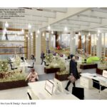 New circulation was introduced to extend the sidewalk into the public spaces on the lower levels of the building, by connecting the restaurant, cafes, terraces and food lab through a series of ramps directly linked to the street. The extension of this public route, and a visually transparent ground floor, alleviate the awkward relationship of the building envelope with the street, and creates a much-improved entrance condition.