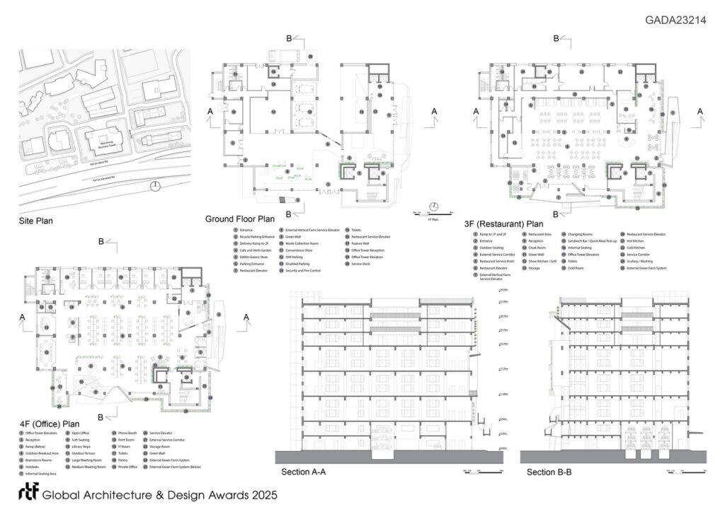 A key feature is the façade greening system used to grow crops on the South, West and East facades. Unlike typical greenwalls, this façade is accessible via corridors and a service elevator. This productive landscape facade serves to provide food crops for the dining establishments; on the ground floor, a store and cafe selling edible greens further encourages consumers to eat more healthily.