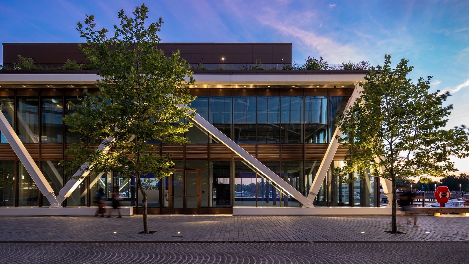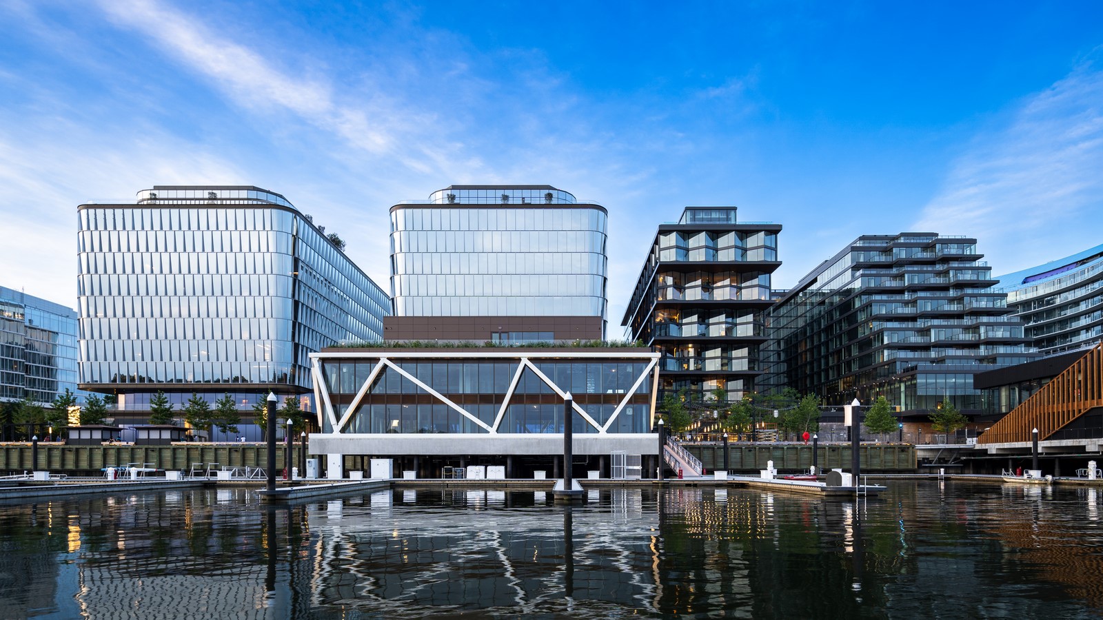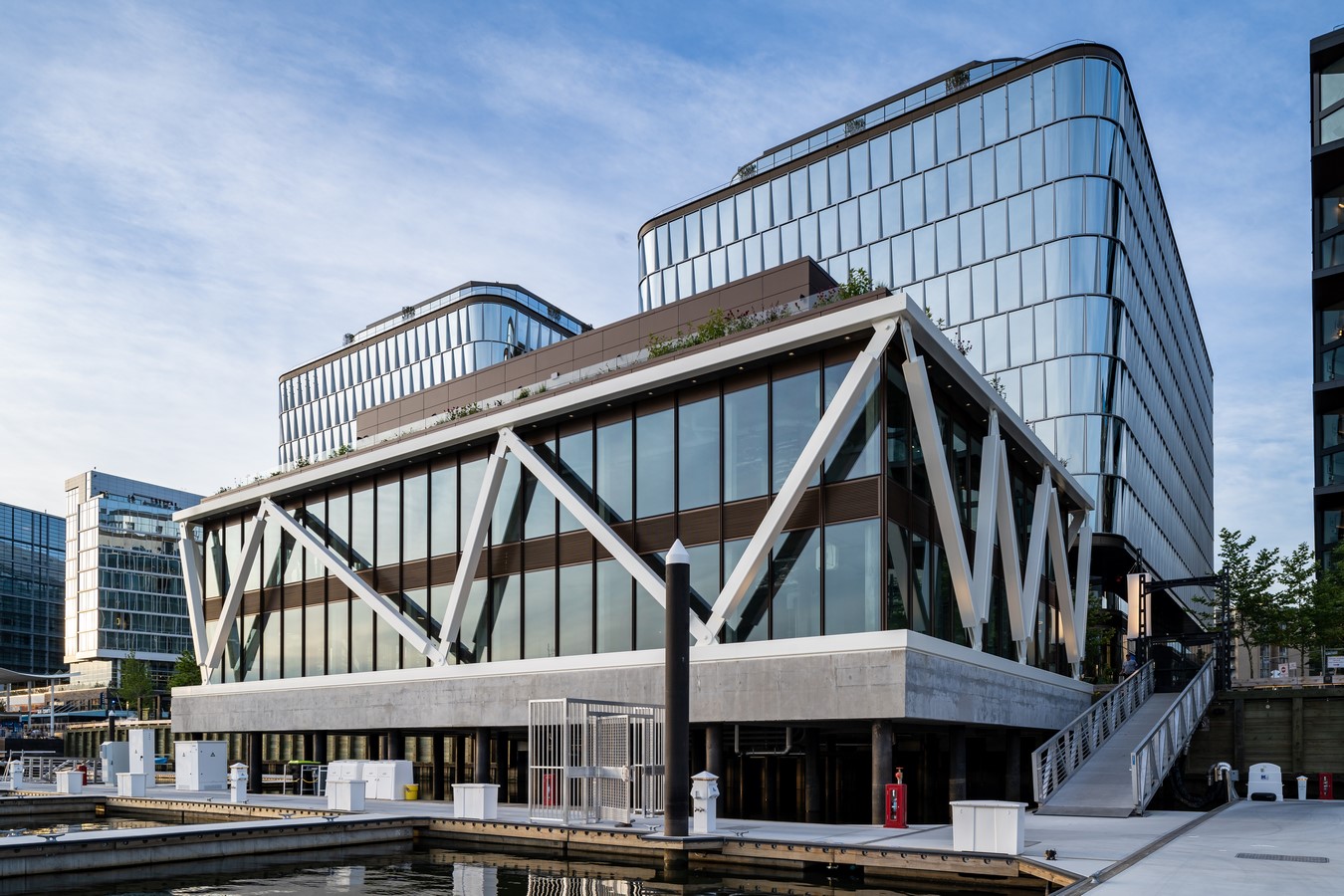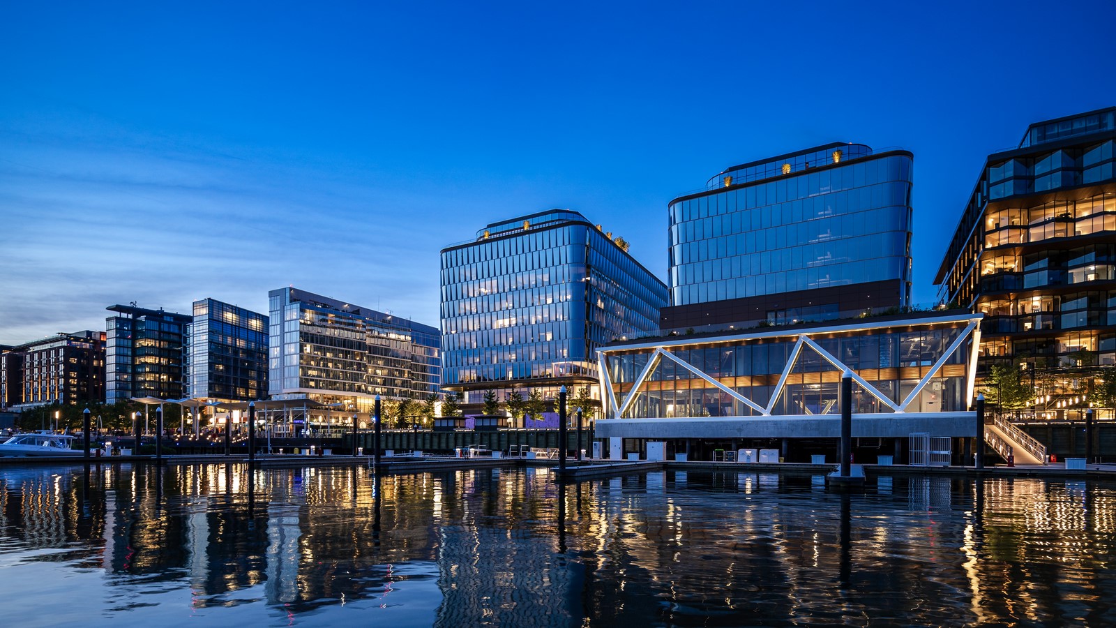 The new Wharf Marina Pavilion, part of the expanding District Wharf development, runs along the water’s edge of the Potomac River’s Washington Channel. One of its main features is Water Building One. A starkly elegant glass box, it stands out due to the signature, structural super truss that encases it. This highly graphic design element elicits an immediate emotional response, drawing crowds to the new building.