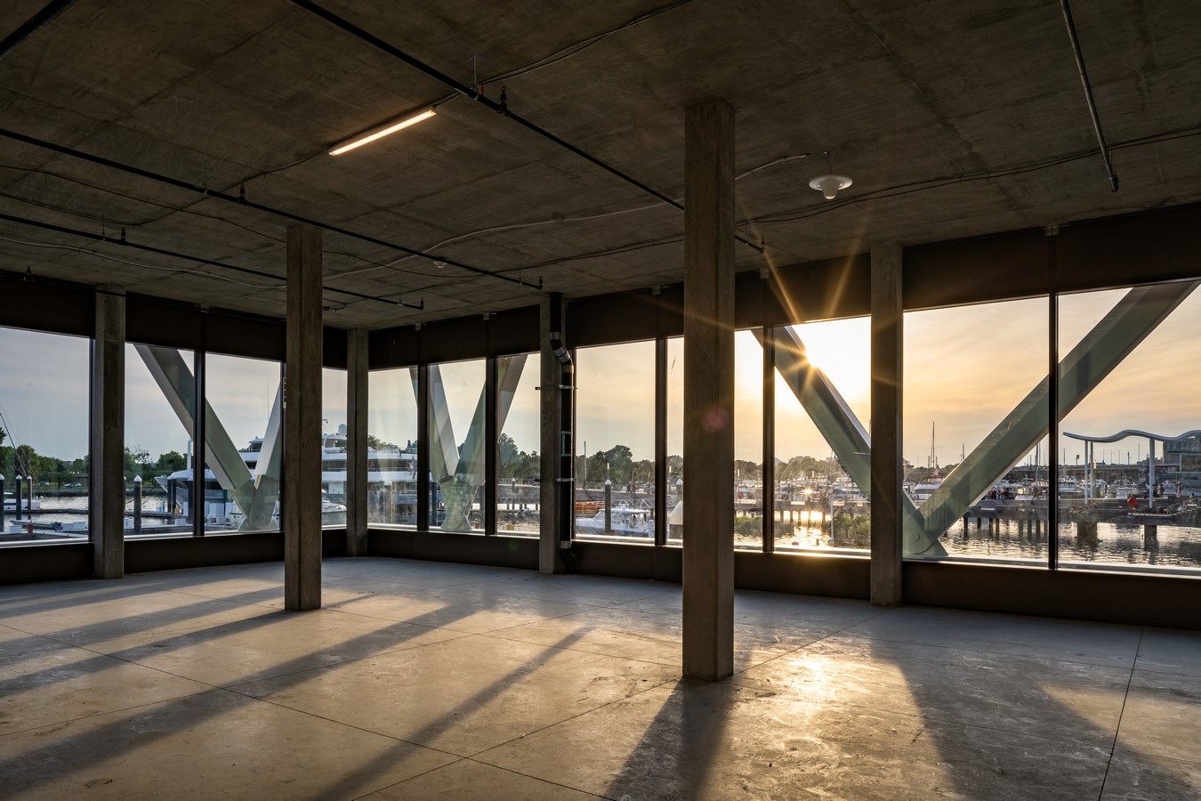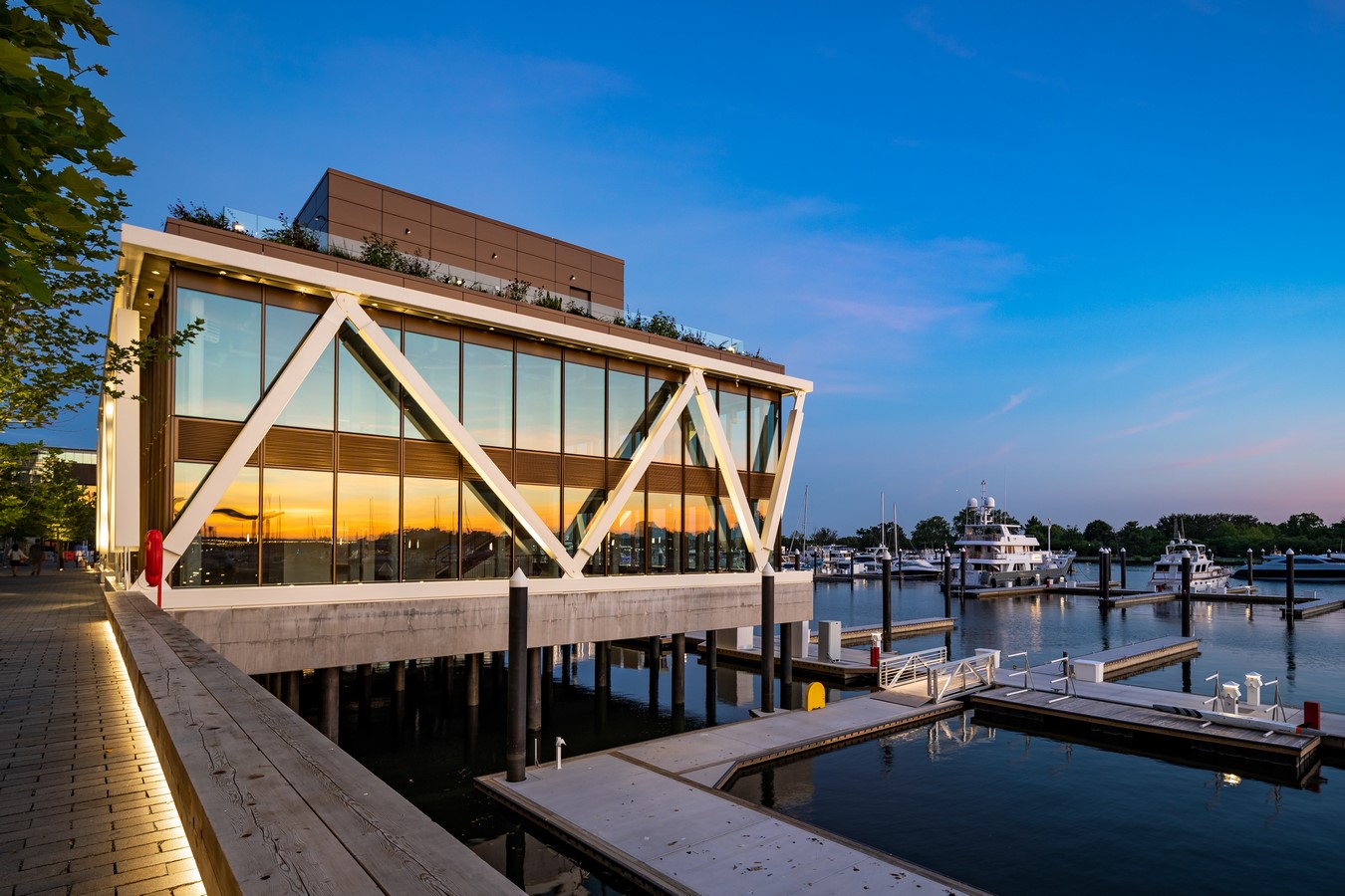 Thanks to the signature truss, a playful, zig- zag, the roof was able to be elevated above the boardwalk, creating space around the building where people can gather. Most critically, it supports the all-glass structure and is why the interior can be open and completely free of columns. “Form is function’, states the design principal. From any vantage point inside, visitors get uninterrupted views towards the Jefferson Memorial, the hundreds of yacht slips, and to the East Potomac Park across the channel.