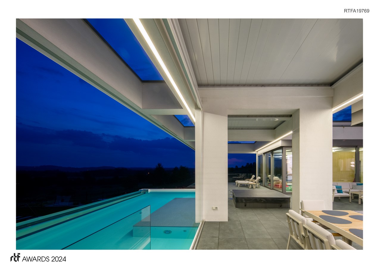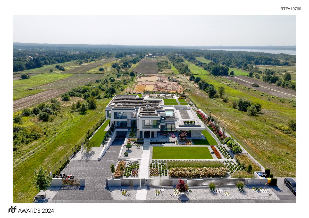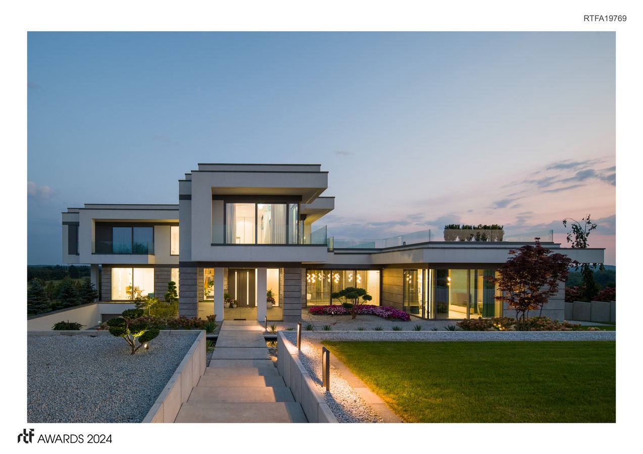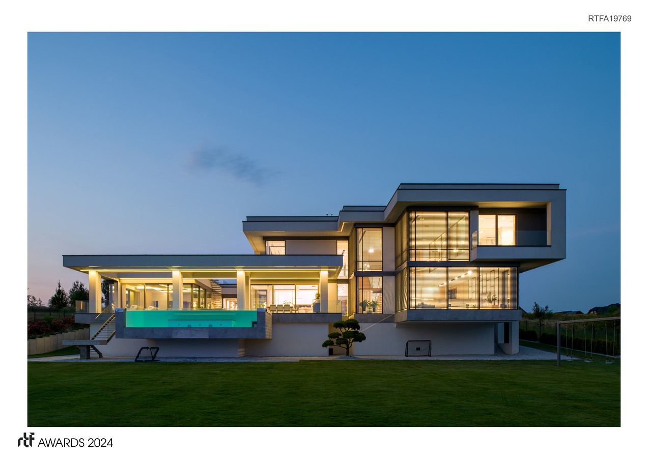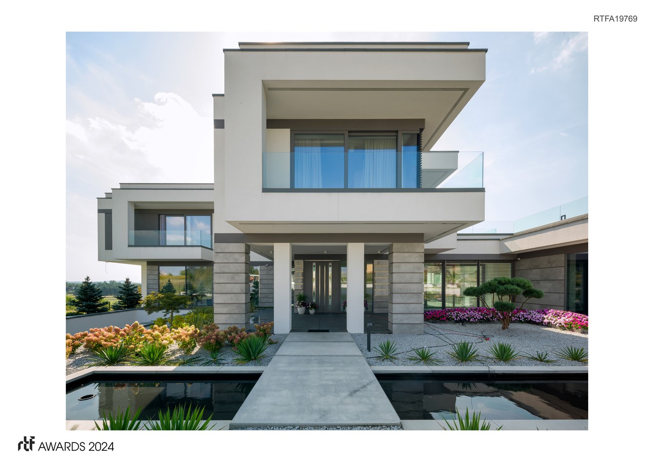 The house features the use of environmentally friendly Porotherm ceramic blocks and natural travertine stone on the façade, emphasizing sustainability of the residence. Furthermore, the incorporation of energy-efficient technologies, including photovoltaic panels on the roof, adds an extra layer of sophistication to the manufacturing process, contributing to partial autonomy and the overall sustainability of the house. The technological aspects of the design enhance performance and efficiency, reflecting a forward-looking approach to harnessing renewable energy – a vision aligned with modern advancements in technology.