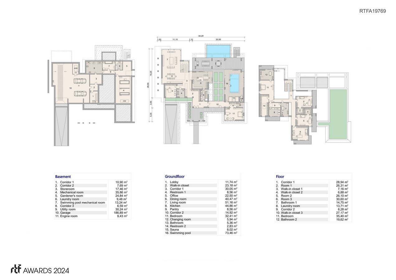 The three-story structure, comprising a basement, ground floor, and attic, unfolds as a harmonious composition. The ground floor is a haven of relaxation, housing a sauna and an indoor pool that seamlessly extends to a terrace equipped with a jacuzzi. The living area integrates the lounge and dining spaces, creating fluidity in daily living. The underground level accommodates technical rooms and a garage, ensuring functionality without compromising aesthetics.