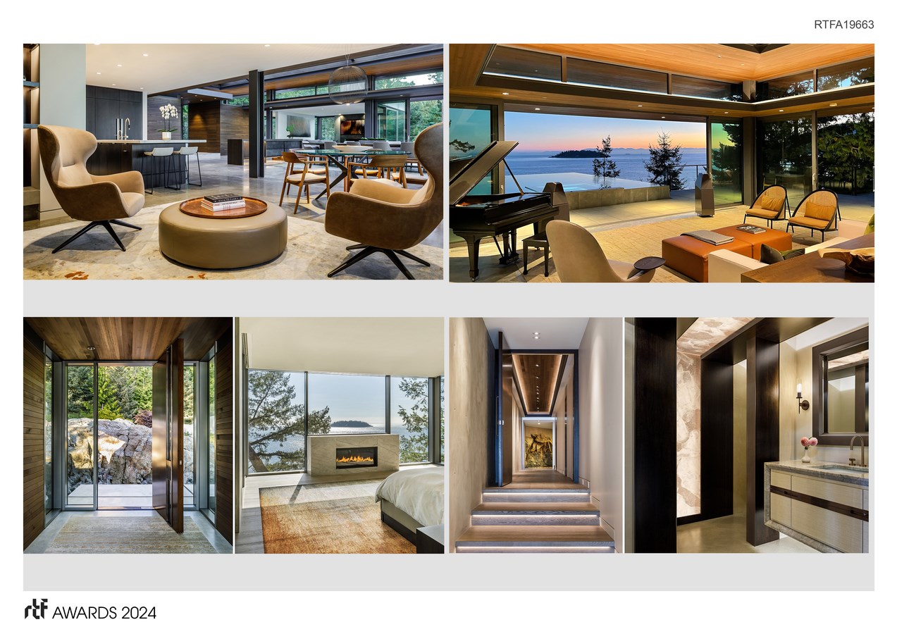 Upon entering the home, guests are presented with a dramatic grand pavilion overlooking the expansive views of the water. The openness of the plan is made intimate by nested, individual spaces within the whole that feel unique, while maintaining a sense of connection with the rest of the project. The challenge here was creating a sense of intimate, interior space without creating division or compromising views to the exterior. Each space is intentionally designed to frame the surrounding natural beauty, allowing exterior views and light to flow to the interior. Greenery covers the low slung, horizontal roofs, allowing the structure to seamlessly integrate into the landscape.