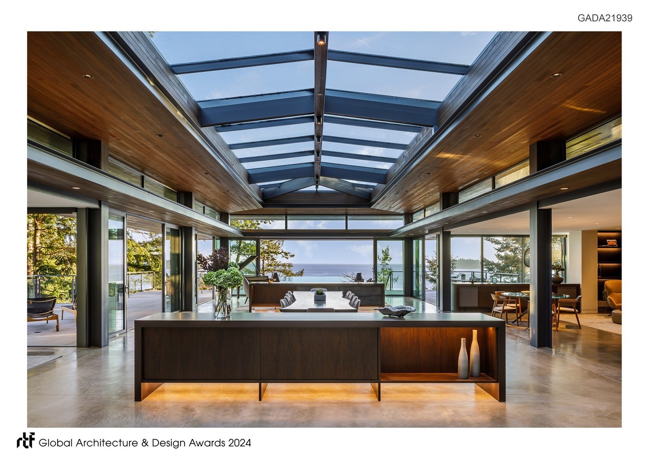 Upon entering the home, guests are welcomed by a dramatic grand pavilion overlooking expansive water views. The openness of the plan is made intimate by nested, individual spaces that feel unique while maintaining a connection to the overall project. The challenge was to create a sense of intimate, interior space without compromising the expansive views or dividing the space. Each area is intentionally designed to frame the surrounding natural beauty, allowing exterior views and light to flow seamlessly into the interior. Greenery covers the low-slung, horizontal roofs, allowing the structure to integrate seamlessly into the landscape.