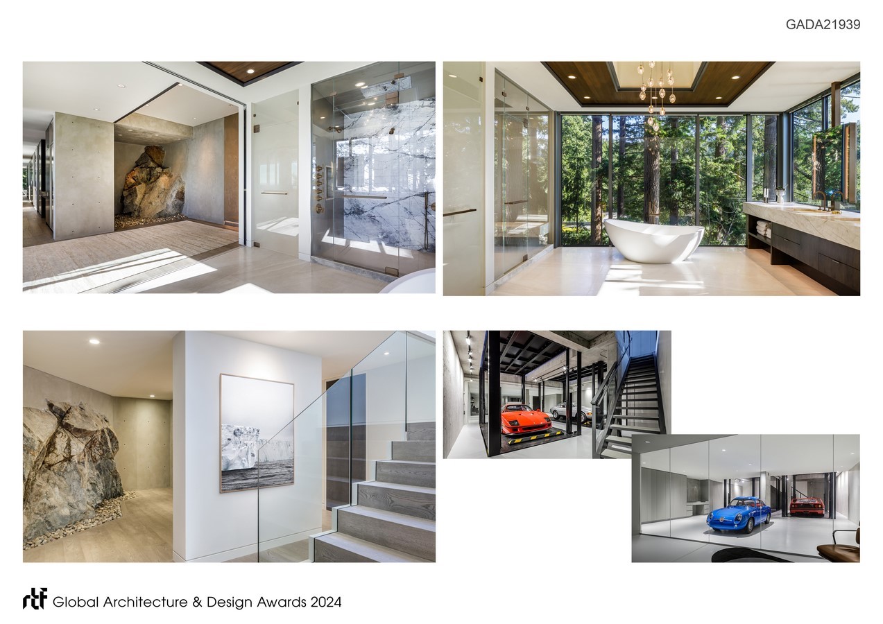 The curated palette of materials reflects the natural elements of the site. The home is nestled into the bedrock, incorporating natural stone as a unique interior feature. Cedar and walnut introduce visual warmth, while blackened steel, glass, and polished concrete provide the dramatic spans found throughout the home. Venetian plaster and textiles soften the interior spaces, and the neutral color palette evokes a sense of restfulness and contemplation.